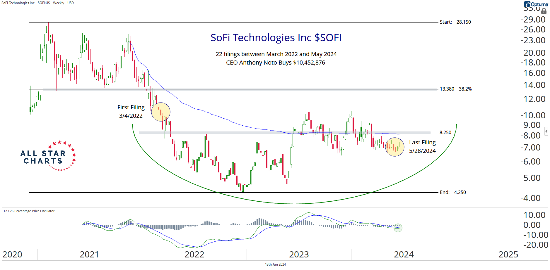 Between March 2022 and May 2024, Noto filed 22 Form 4s with the SEC, reporting purchases of SOFI shares totaling $10,452,876.