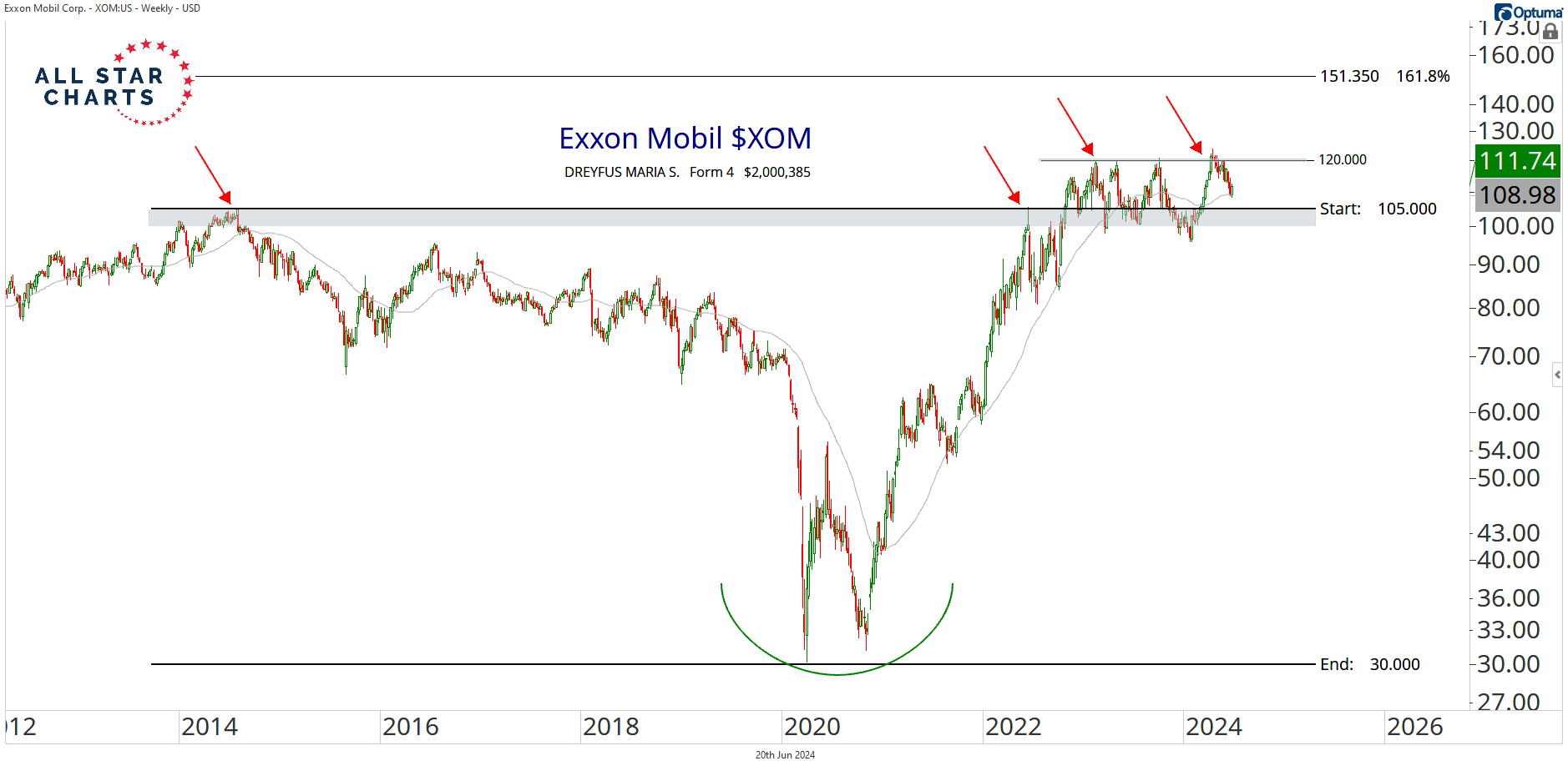 XOM has been trading sideways above former resistance turned support for almost two years: