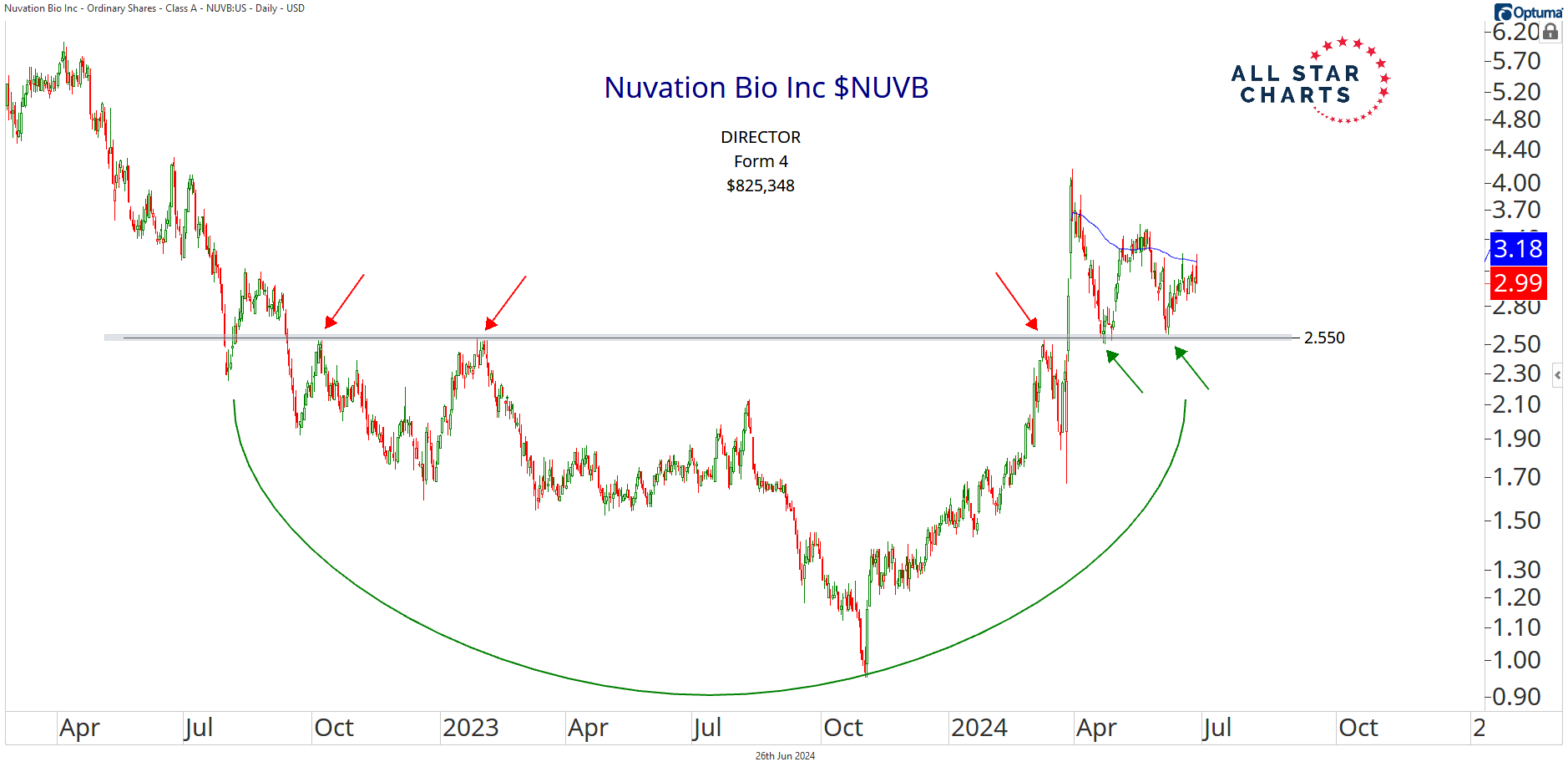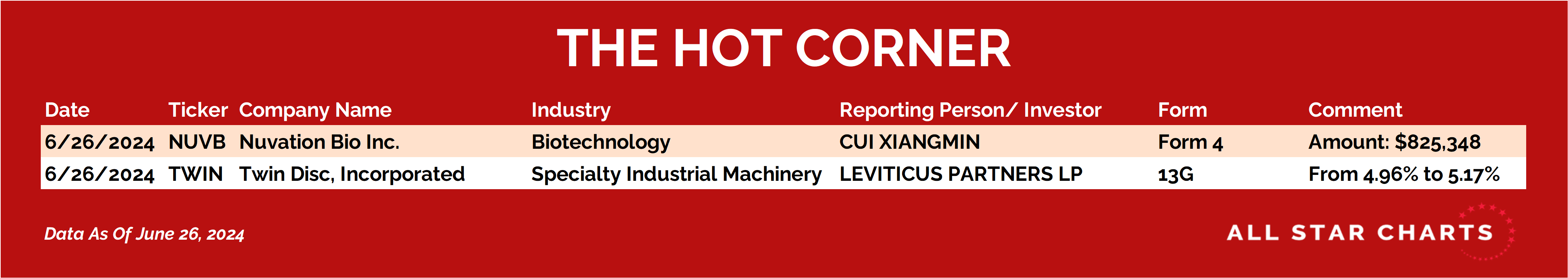 The Hot Corner Alfonso De Pablos tracks insider buys to spot smart money moves. Director Cui Reveals Another Big NUVB Purchase By Steve Strazza June 27, 2024 The most significant insider buy on today's list comes via a Form 4 filing by Nuvation Bio Inc $NUVB director Xiangmin Cui.Cui revealed an additional purchase of NUVB shares with a total value of $825,348.Here’s The Hot Corner, with data through June 26, 2024: Leviticus Partners LP filed a 13G for Twin Disc Incorporated $TWIN revealing an increase from 4.96% to 5.17%.Earlier this year, NUVB resolved higher from a bearish-to-bullish reversal pattern. Fast-forward to today, and it is consolidating above the breakout level: As long as we’re above 2.55, the bias is higher.Stay tuned. We'll be back on Friday with more insider activity.And please reach out with any questions. We love hearing from you! For questions about your membership, contact us at 323-421-7910 or info@stockmarketmedia.com More from The Hot Corner Alfonso Depablos, CMT Director Laurette T. Koellner Reports a $2.05 Million $CLS Purchase October 31, 2025 Alfonso Depablos, CMT The Whole C-Suite Is Buying $OBK Shares October 29, 2025 Alfonso Depablos, CMT Executive Chairman Richard Kinder Reports a $26 Million $KMI Purchase October 29, 2025 Follow the Smart MoneyThe Hot Corner tracks where corporate insiders are buying — revealing which companies top executives are betting on before the crowd. You must have JavaScript enabled to use this form. Email Address