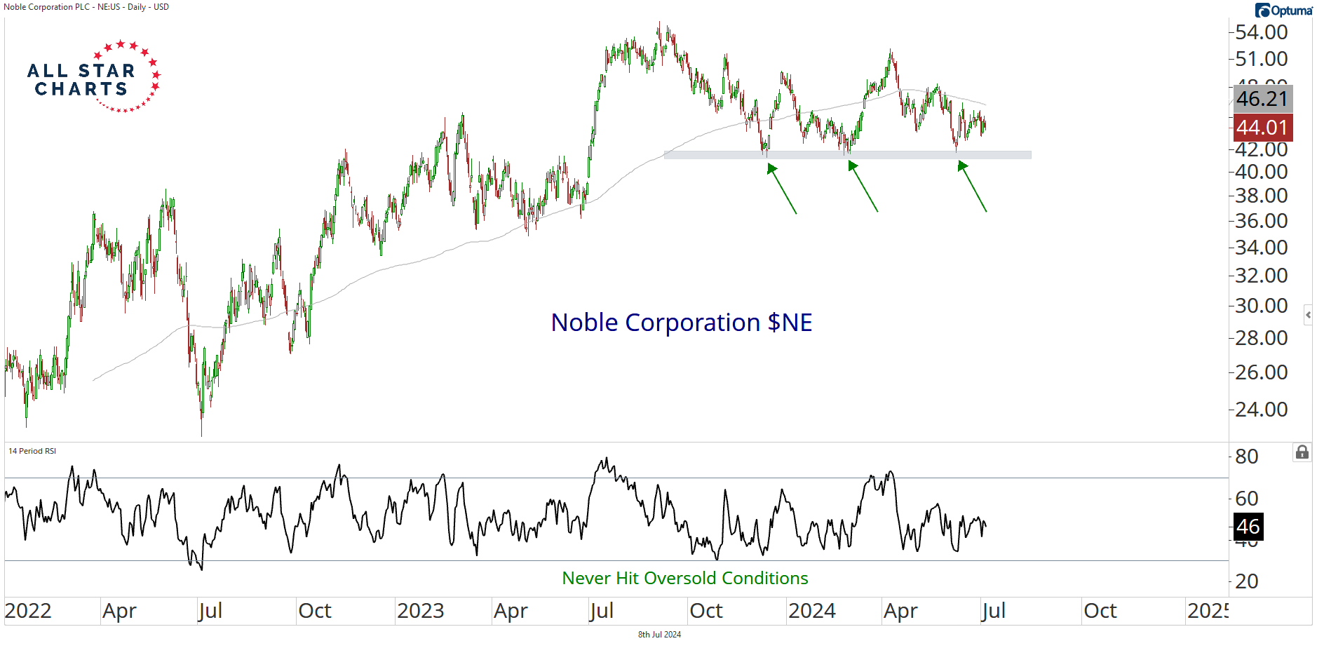 NE is consolidating in a well-defined range within the context of an underlying uptrend.