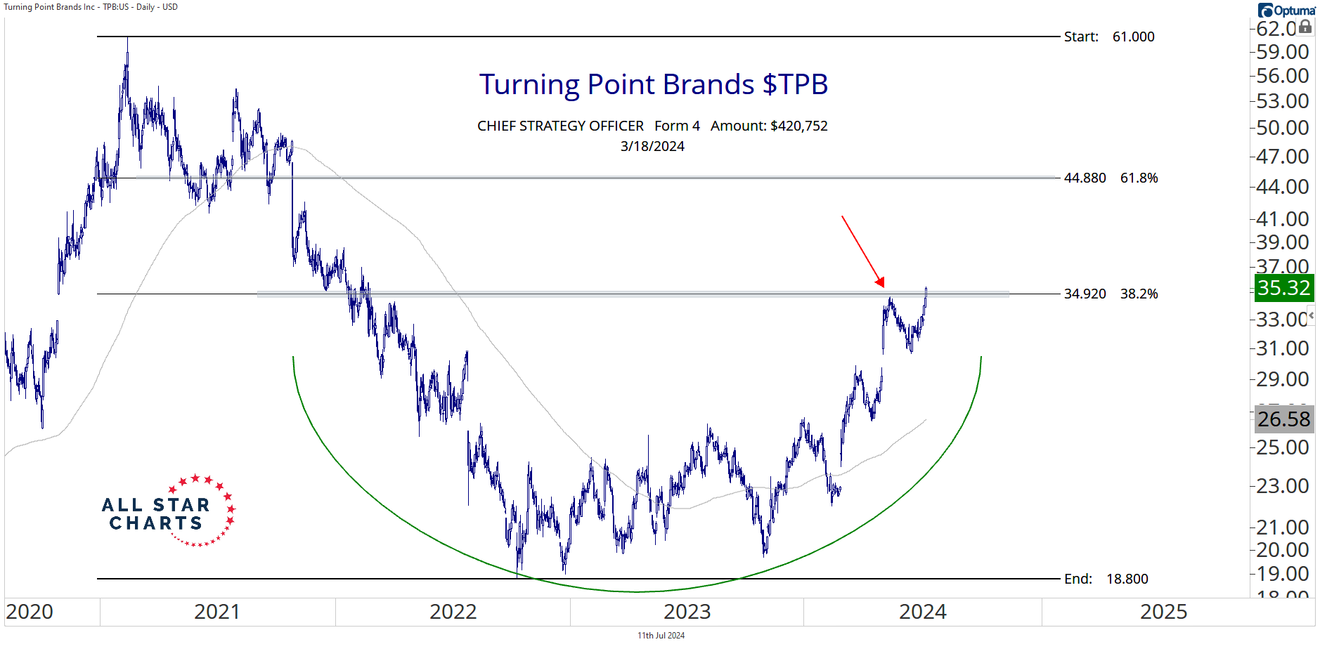TPB is reclaiming the 38.2% retracement of the prior drawdown as it continues to print new 52-week highs.