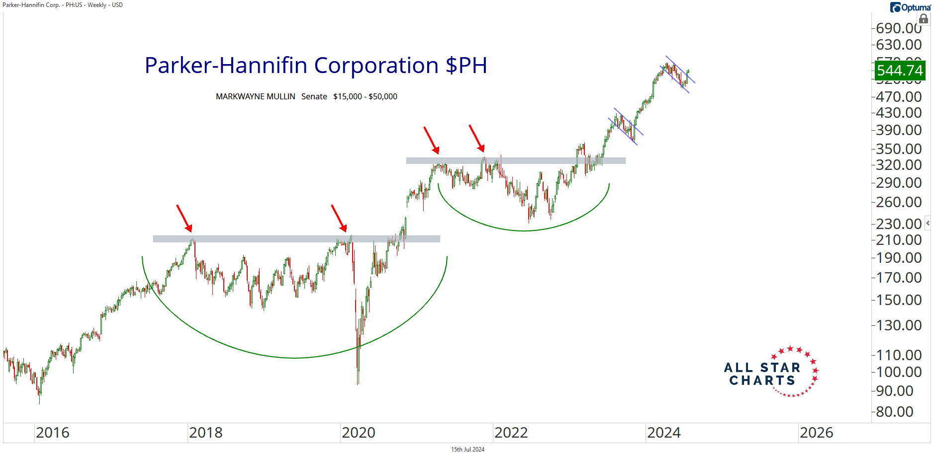 PH has been stair-stepping higher and consolidating constructively along the way since it broke out of a massive base in 2020.