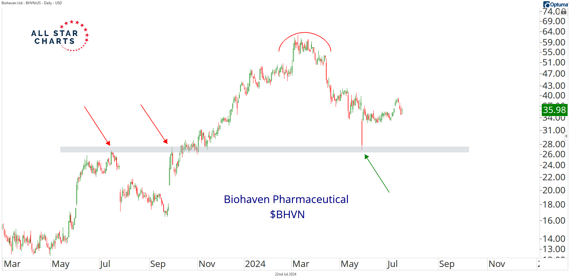 BHVN came public in September 2022 and ripped higher with authority. However, price has retraced some gains since it peaked in March, successfully retesting a critical polarity level.