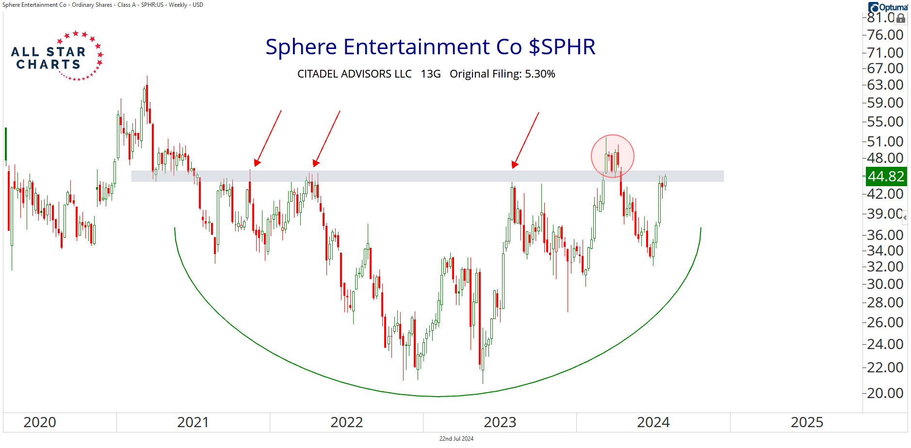 SPHR has been in the base-building process for roughly three years as buyers try to take control and force an upside resolution from this rounding bottom formation: