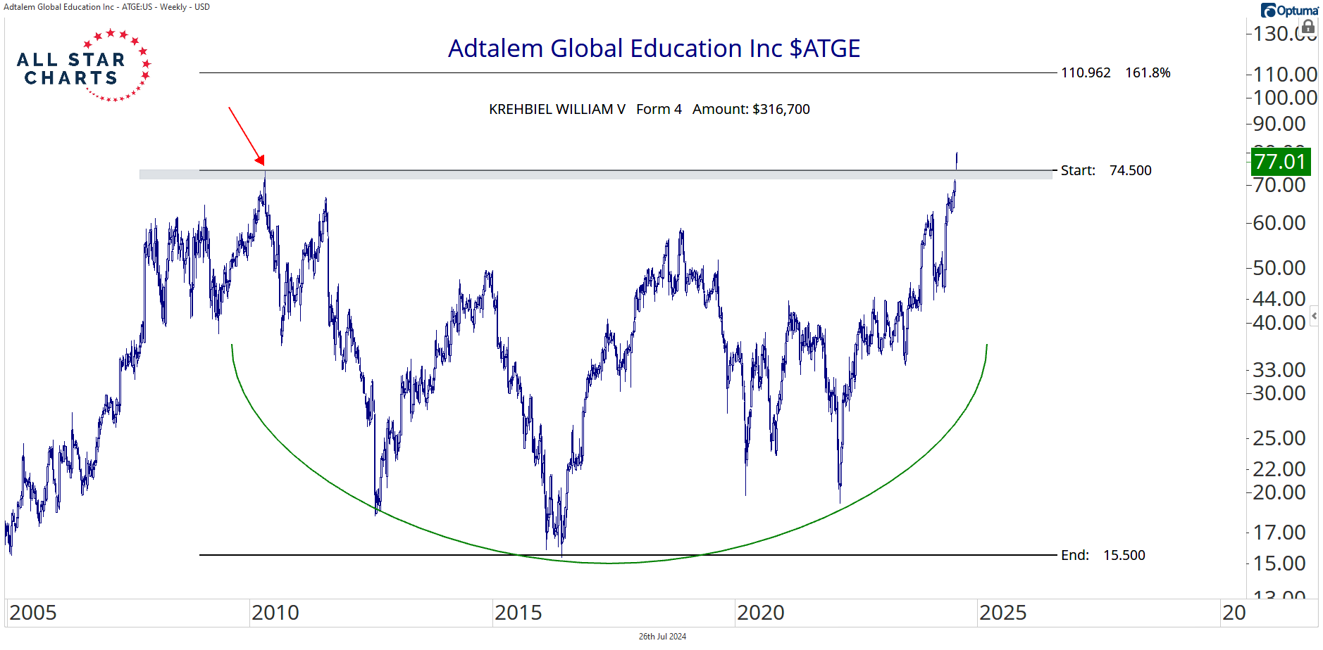 Adtalem Global Education is trading at its highest level in history after putting the finishing touches on a multi-decade base.
