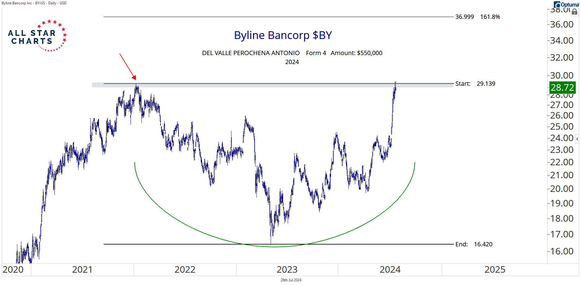 BY has been building a constructive basing pattern for roughly three years now. Momentum has accelerated in the past few weeks, and the stock is currently challenging the upper bounds of the range.