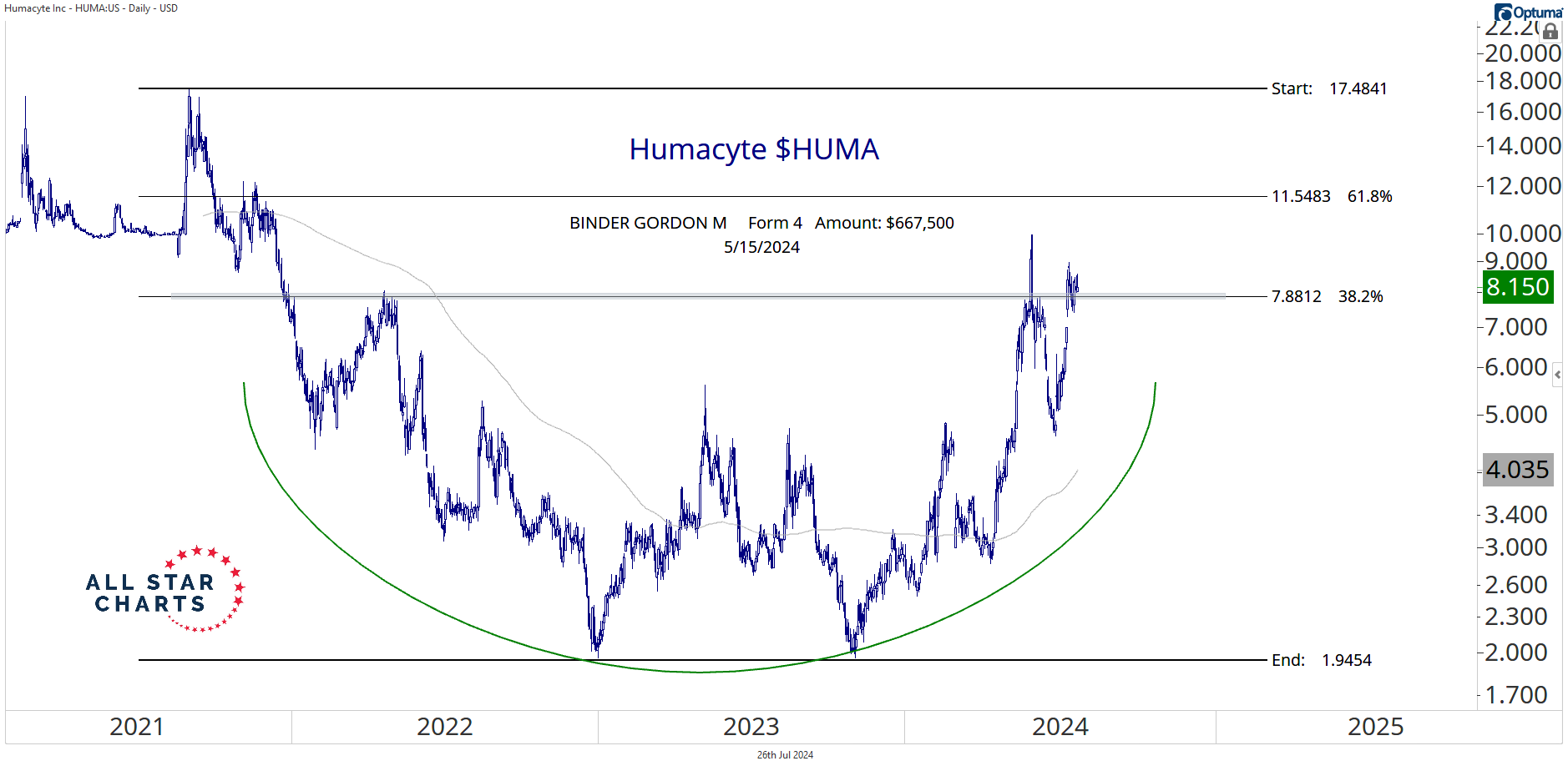 As long as we're above 7.90, the path of least resistance is higher and we want to own HUMA with a target of 11.50 over the next 1-3 months and a secondary objective of 17.50 over longer timeframes.