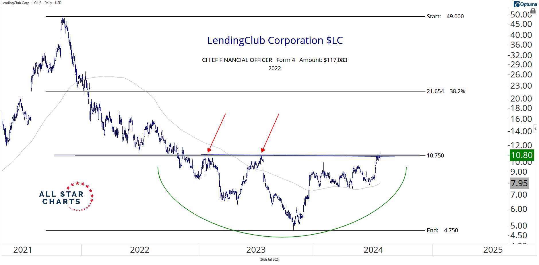 LendingClub collapsed by over 90% after peaking in late 2021. The stock has been carving out a multi-year bearish-to-bullish reversal pattern and looks poised to resolve higher in the coming days and weeks.