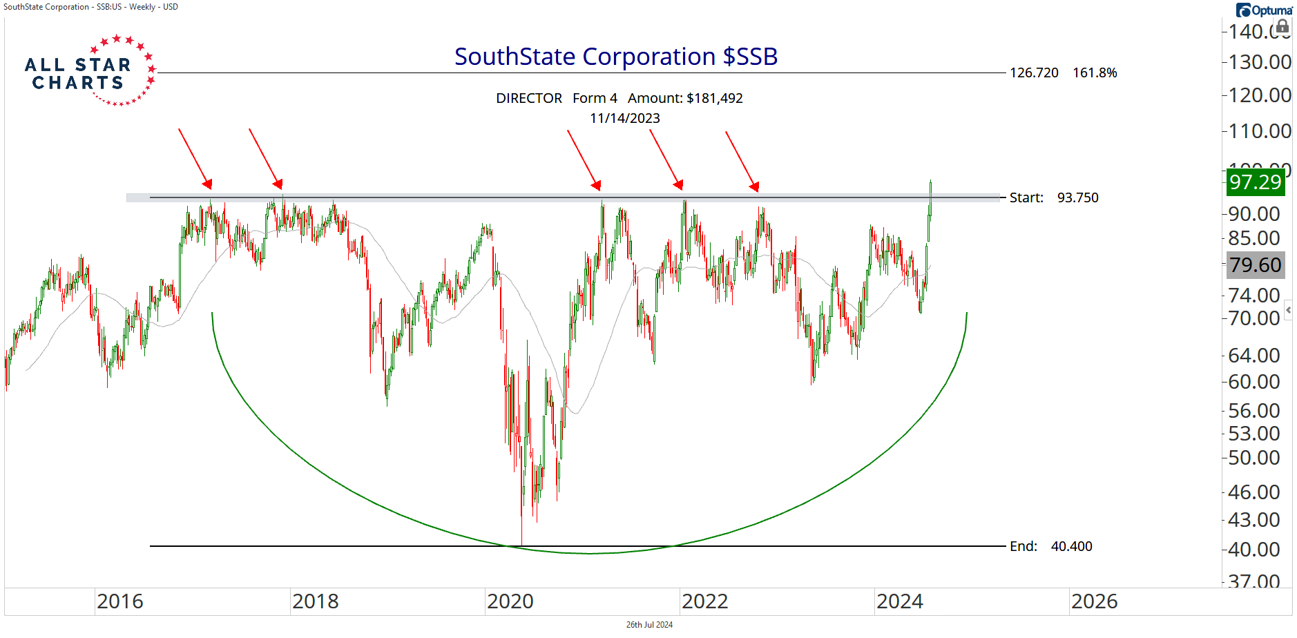 SouthState is pressing against a shelf of former highs as it looks poised to complete a massive consolidation pattern.