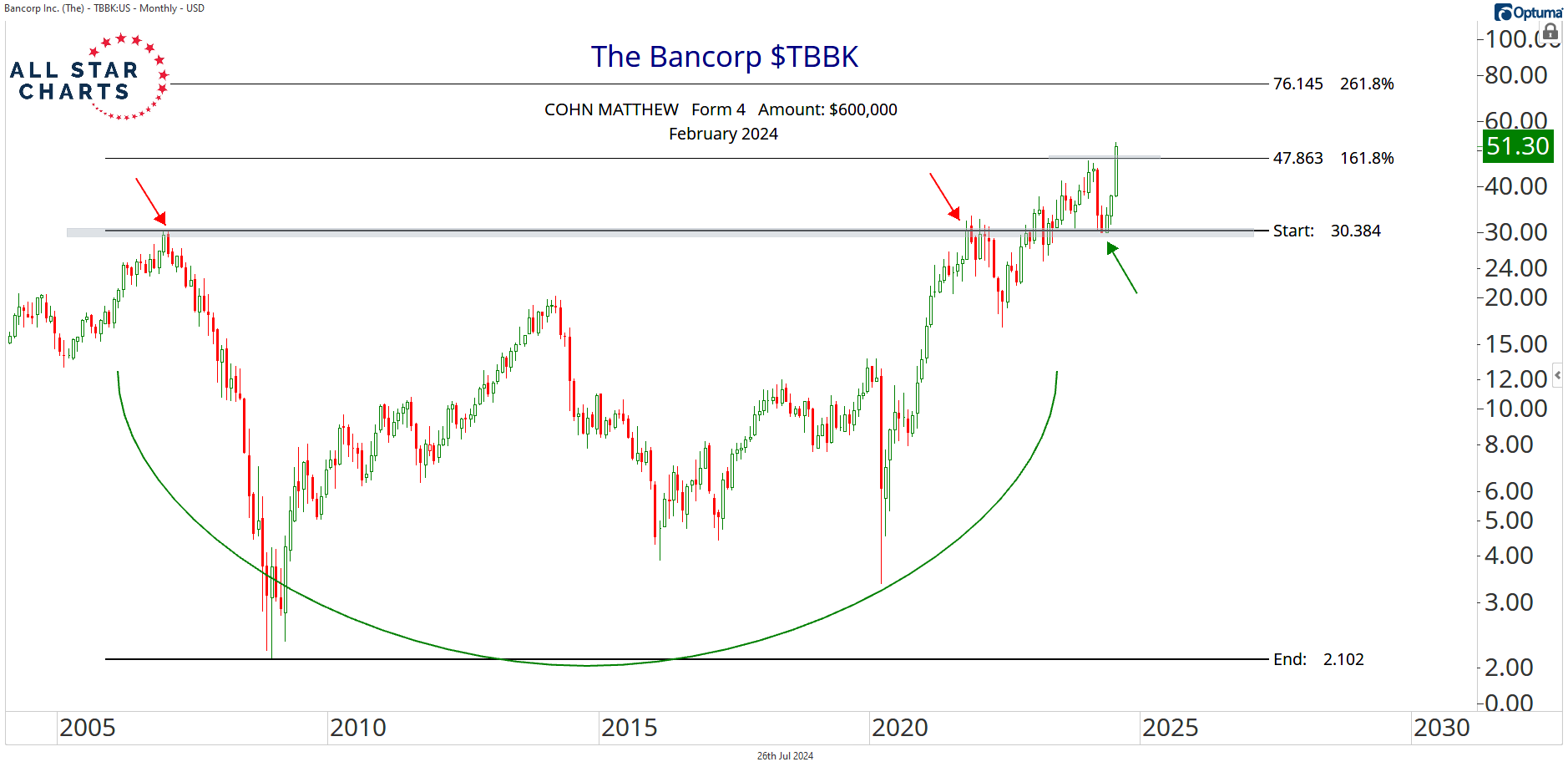 The Bancorp is making new all-time highs as it decisively clears a key extension level from a multi-decade basing pattern.