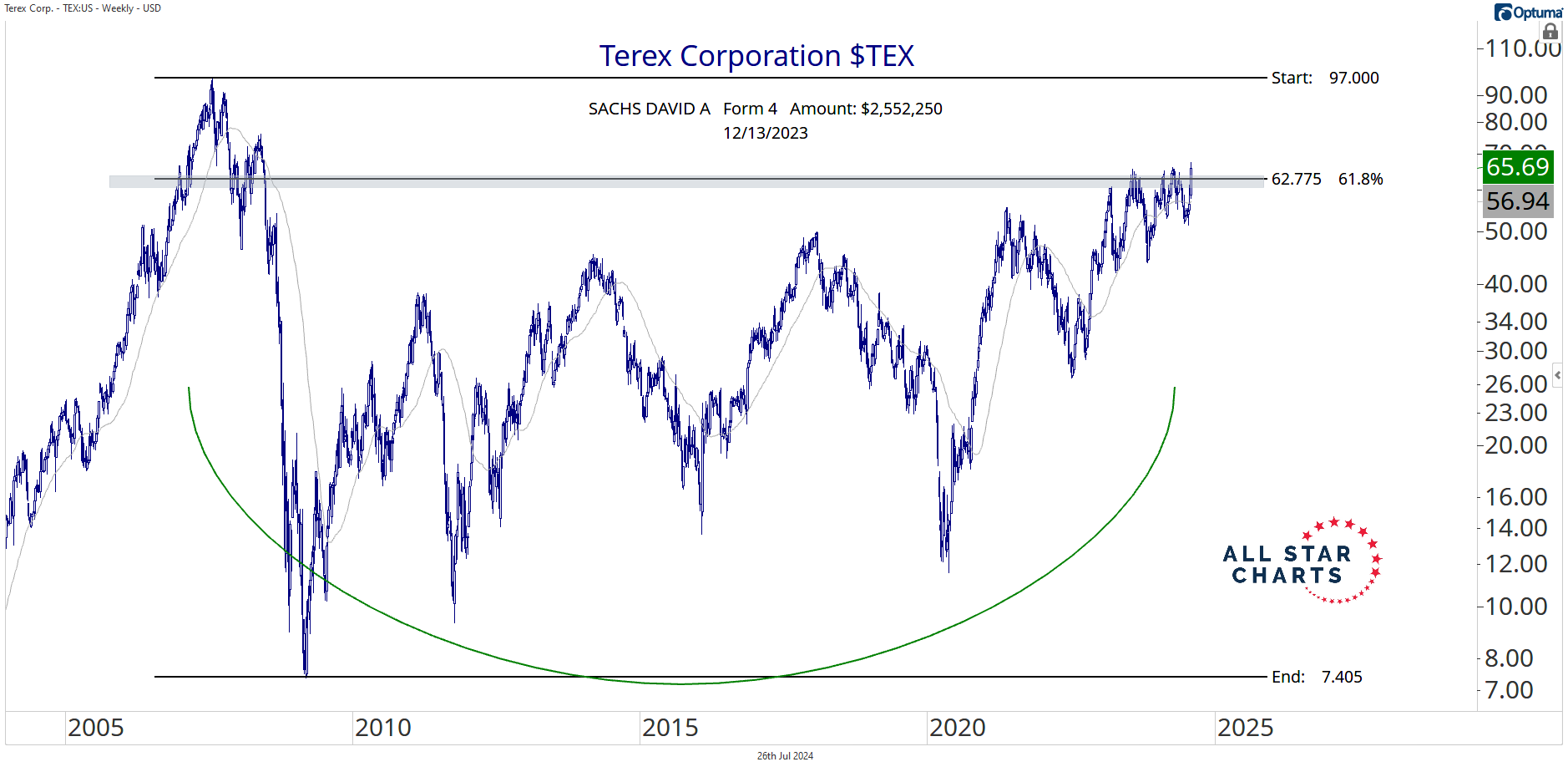 Terex is reclaiming a key level of interest at the 61.8% retracement of the prior drawdown and is making new 16-year highs.