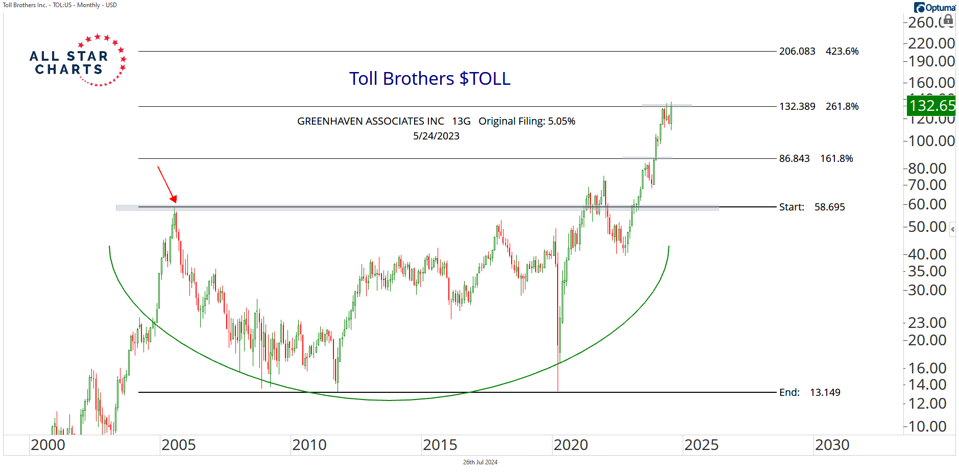 After finishing a multi-decade basing pattern, Toll Brothers has screamed higher to its second extension level and shows no signs of slowing down.