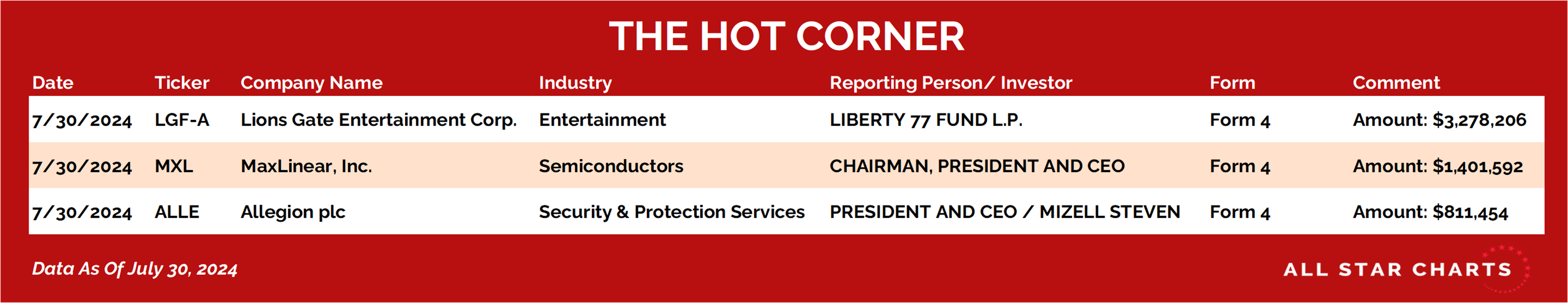 The Hot Corner Alfonso De Pablos tracks insider buys to spot smart money moves. Liberty 77 Fund Reports a $3.3 Million LGF Purchase By Steve Strazza July 31, 2024 The most significant insider buy on today's list comes via a Form 4 filing by Liberty 77 Fund L.P.The private equity firm revealed an additional purchase of $3,278,206 in Lions Gate Entertainment Corp $LGF.The CEO of MaxLinear Inc $MXL, Kishore Seendripu, bought 108,303 shares, equivalent to $1.4 million of his own company’s stock.Here’s The Hot Corner, with data from July 30, 2024: The president and CEO of Allegion plc $ALLE, as well as one of its directors, filed Form 4s disclosing a total purchase of $811,454.ALLE has been building a massive base for the last four years.The stock has been on fire, rallying 18% in a near-vertical line since the beginning of the month to the upper bounds of its range. We think it’s only a matter of time before buyers absorb the remaining overhead supply and break Allegion out of this base.Stay tuned. We'll be back on Thursday with more insider activity.And please reach out with any questions. We love hearing from you! For questions about your membership, contact us at 323-421-7910 or info@stockmarketmedia.com More from The Hot Corner Alfonso De Pablos, CMT Director Laurette T. Koellner Reports a $2.05 Million $CLS Purchase October 31, 2025 Alfonso De Pablos, CMT The Whole C-Suite Is Buying $OBK Shares October 29, 2025 Alfonso De Pablos, CMT Executive Chairman Richard Kinder Reports a $26 Million $KMI Purchase October 29, 2025 Follow the Smart MoneyThe Hot Corner tracks where corporate insiders are buying — revealing which companies top executives are betting on before the crowd. You must have JavaScript enabled to use this form. Email Address