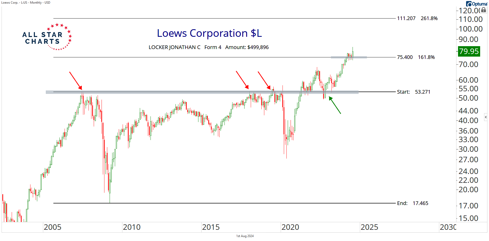 After completing a multi-decade basing pattern in 2021, Loews Corporation has screamed higher to the 161.8% extension level and shows no signs of slowing down.