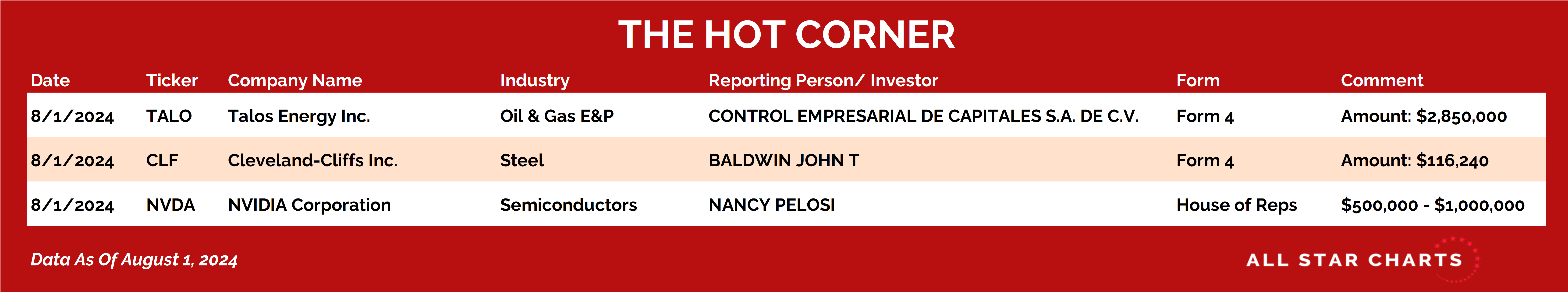 The Hot Corner Alfonso De Pablos tracks insider buys to spot smart money moves. Control Empresarial Reports a $2.8 Million TALO Purchase By Steve Strazza August 2, 2024 The most significant insider buy on today’s list comes via a Form 4 filing by Control Empresarial de Capitales S.A. de C.V.The Mexico-based investment company reported purchases totaling $2.8 million in Talos Energy Inc $TALO.Here’s The Hot Corner, with data from August 1, 2024: Director John T Baldwin revealed the acquisition of 8,000 shares of Cleveland-Cliffs Inc $CLF.Last but not least, former Speaker of the House Nancy Pelosi bought 10,000 shares of NVIDIA Corporation $NVDA.NVDA has been stair-stepping higher and consolidating constructively along the way since a huge base-breakout in May 2023. For the last month and a half, the AI leader has been undergoing a corrective wave.NVDA has fallen more than 20% off its highs, reaching a key extension level from above. We’re looking at this as a potential support zone. If NVDA can hold 112, this is just a healthy correction within an ongoing uptrend. However, any breach below 112 could lead to some damage to the primary trend.Have a great weekend. We'll be back on Monday with more insider activity.And please reach out with any questions. We love hearing from you! For questions about your membership, contact us at 323-421-7910 or info@stockmarketmedia.com More from The Hot Corner Alfonso De Pablos, CMT Director Laurette T. Koellner Reports a $2.05 Million $CLS Purchase October 31, 2025 Alfonso De Pablos, CMT The Whole C-Suite Is Buying $OBK Shares October 29, 2025 Alfonso De Pablos, CMT Executive Chairman Richard Kinder Reports a $26 Million $KMI Purchase October 29, 2025 Follow the Smart MoneyThe Hot Corner tracks where corporate insiders are buying — revealing which companies top executives are betting on before the crowd. You must have JavaScript enabled to use this form. Email Address