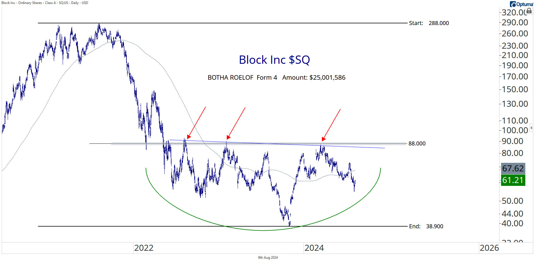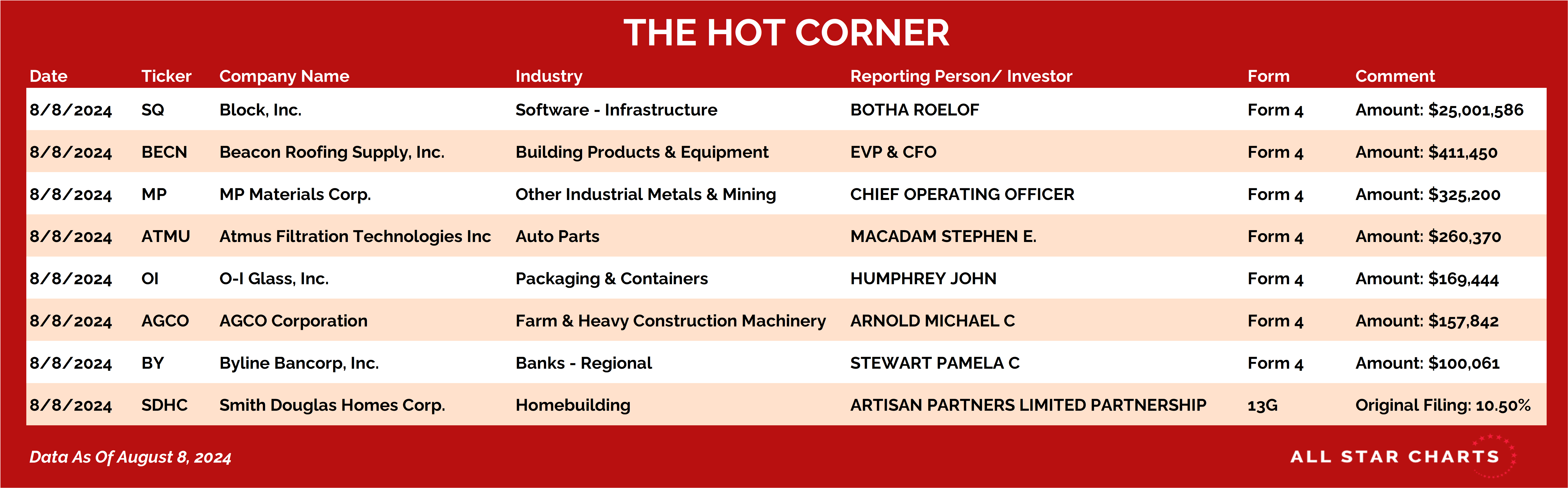 The Hot Corner Alfonso De Pablos tracks insider buys to spot smart money moves. Director Botha Reports a $25 Million SQ Purchase By Steve Strazza August 9, 2024 Today’s most significant insider transaction comes in a Form 4 filing by Block $SQ director Roelof Botha.Botha reported a $25 million purchase of SQ shares.Artisan Partners Limited Partnership filed a 13G for Smith Douglas Homes Corp $SDHC revealing an initial stake of 10.50%.Here’s The Hot Corner, with data from August 8, 2024: In another Form 4, the chief operating officer of MP Materials Corp $MP, Michael Stuart Rosenthal, revealed an acquisition of 30,000 shares.There was also insider activity in O-I Glass $OI, AGCO Corporation $AGCO, and Byline Bancorp Inc $BY.SQ has been working on a reversal basing pattern since 2022.Accumulation patterns like this tend to take time, as the trend gradually shifts from down to sideways to higher. While the bulls have work to do, we prefer to wait for a decisive upside resolution above the 88 level.If and when that happens, we can have conviction the trend has turned higher for SQ.Have a great weekend. We'll be back on Monday with more insider activity.And please reach out with any questions. We love hearing from you! For questions about your membership, contact us at 323-421-7910 or info@stockmarketmedia.com More from The Hot Corner Alfonso De Pablos, CMT Director Laurette T. Koellner Reports a $2.05 Million $CLS Purchase October 31, 2025 Alfonso De Pablos, CMT The Whole C-Suite Is Buying $OBK Shares October 29, 2025 Alfonso De Pablos, CMT Executive Chairman Richard Kinder Reports a $26 Million $KMI Purchase October 29, 2025 Follow the Smart MoneyThe Hot Corner tracks where corporate insiders are buying — revealing which companies top executives are betting on before the crowd. You must have JavaScript enabled to use this form. Email Address