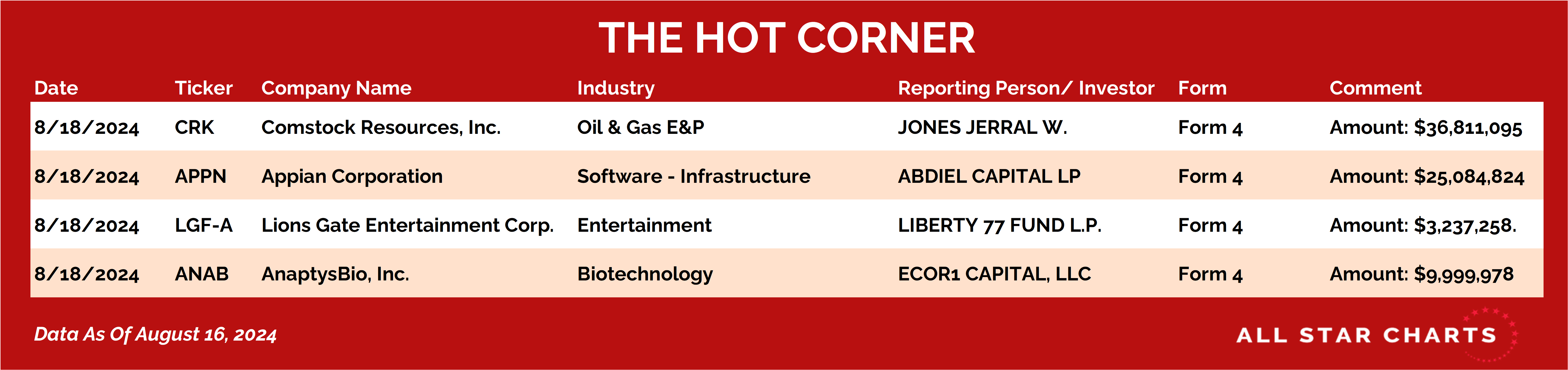 The Hot Corner Alfonso De Pablos tracks insider buys to spot smart money moves. Jerry Jones Reports a $36 Million CRK Purchase By Steve Strazza August 19, 2024 The most significant insider buy on today’s list comes via a Form 4 filing by the owner of the Dallas Cowboys, Jerry Jones.Jones purchased an additional $36 million in Comstock Resources $CRK.EcoR1 Capital just announced an acquisition of 273,972 shares of AnaptysBio Inc $ANAB, equivalent to $10 million.Here’s The Hot Corner, with data from August 16, 2024: In another Form 4, Abdiel Capital LP revealed a purchase of $25,084,824 in Appian Corporation $APPN.ANAB is in the process of completing a multi-year reversal pattern.Price is pressing against the upper bounds of the base as buyers absorb the overhead supply at this resistance zone. If and when we get a decisive breakout above 38, the path of least resistance will shift higher.Stay tuned. We'll be back on Tuesday with more insider activity.And please reach out with any questions. We love hearing from you! For questions about your membership, contact us at 323-421-7910 or info@stockmarketmedia.com More from The Hot Corner Alfonso De Pablos, CMT Director Laurette T. Koellner Reports a $2.05 Million $CLS Purchase October 31, 2025 Alfonso De Pablos, CMT The Whole C-Suite Is Buying $OBK Shares October 29, 2025 Alfonso De Pablos, CMT Executive Chairman Richard Kinder Reports a $26 Million $KMI Purchase October 29, 2025 Follow the Smart MoneyThe Hot Corner tracks where corporate insiders are buying — revealing which companies top executives are betting on before the crowd. You must have JavaScript enabled to use this form. Email Address