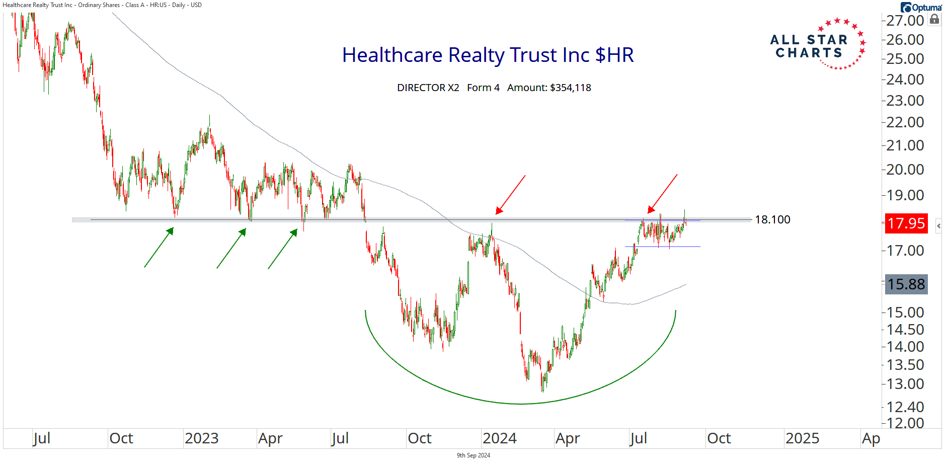 HR has been in the base-building process for roughly a year as buyers try to take control and force an upside resolution from this short-term rounding bottom formation: