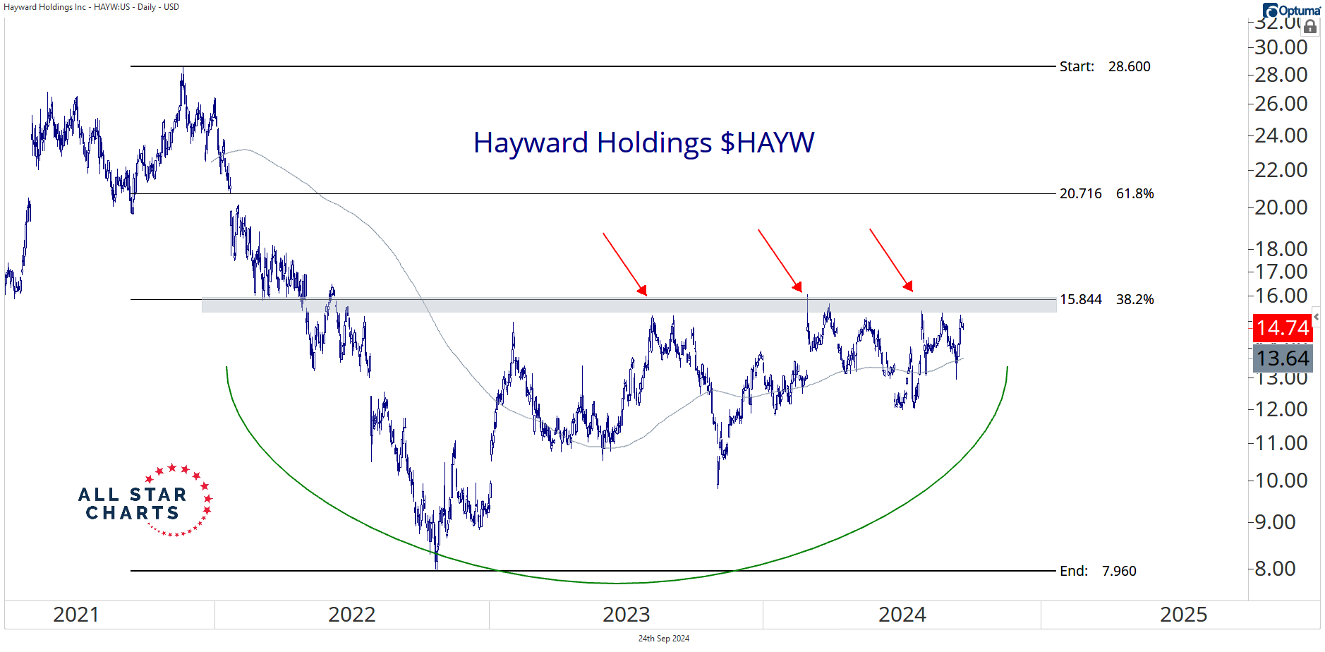 HAYW has been in the base-building process for over two years as buyers try to take control and force an upside resolution from this rounding bottom formation: