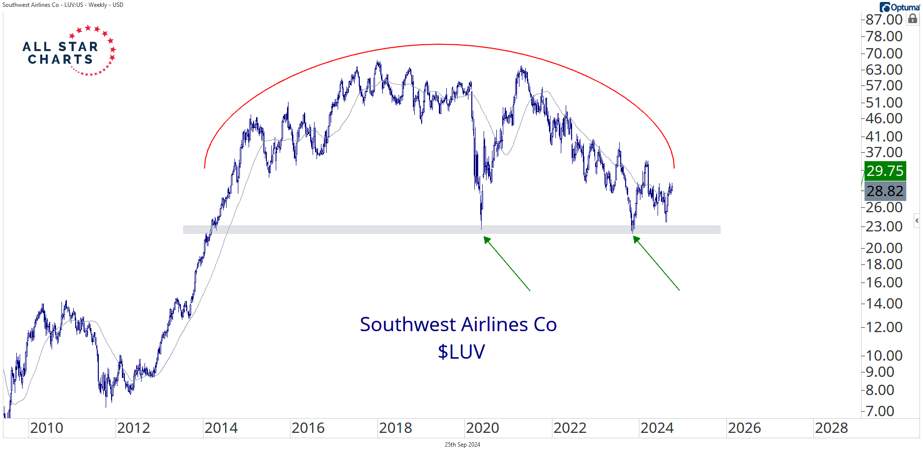 The path of least resistance doesn’t point lower for LUV until bears complete the topping formation by taking out those former 2020 lows.