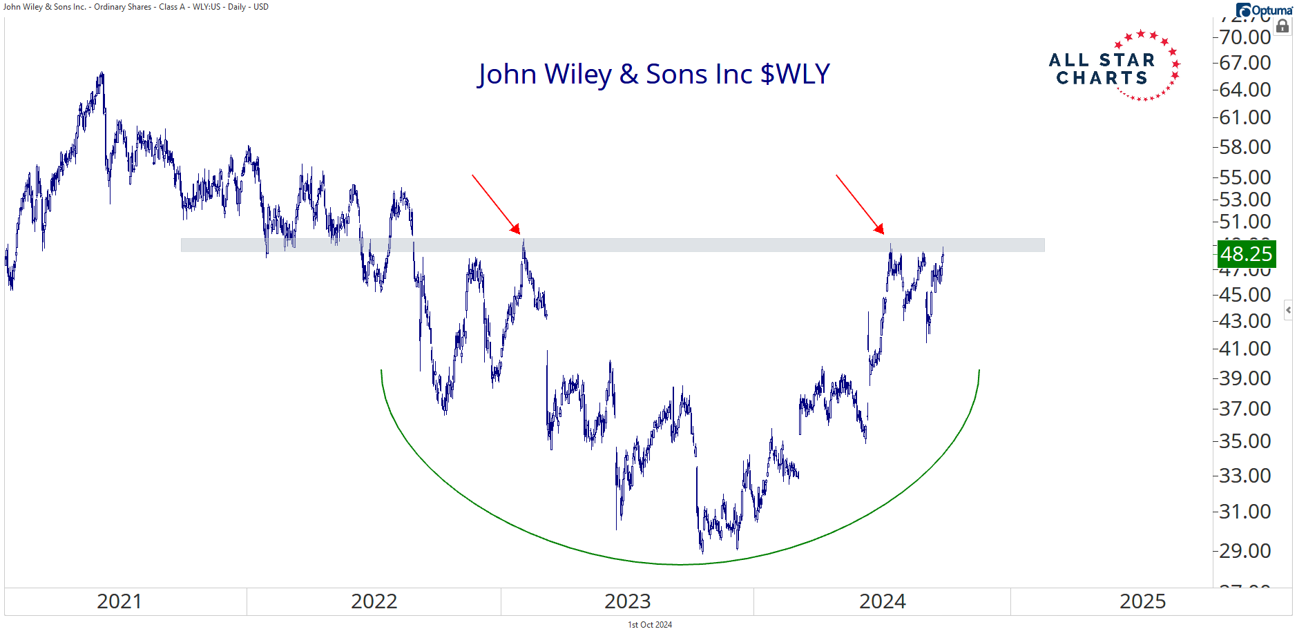 The stock has been in the base-building process for over two years as buyers try to take control and force an upside resolution from this rounding bottom formation: