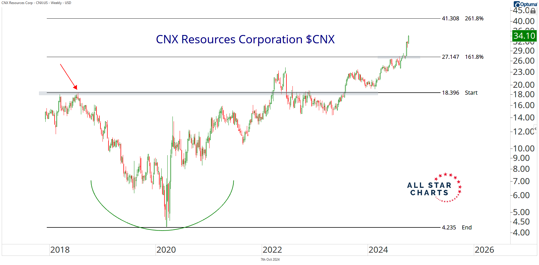 After breaking out of a multi-year base in 2023, CNX has been accelerating to the upside, making a series of higher highs and higher lows since: