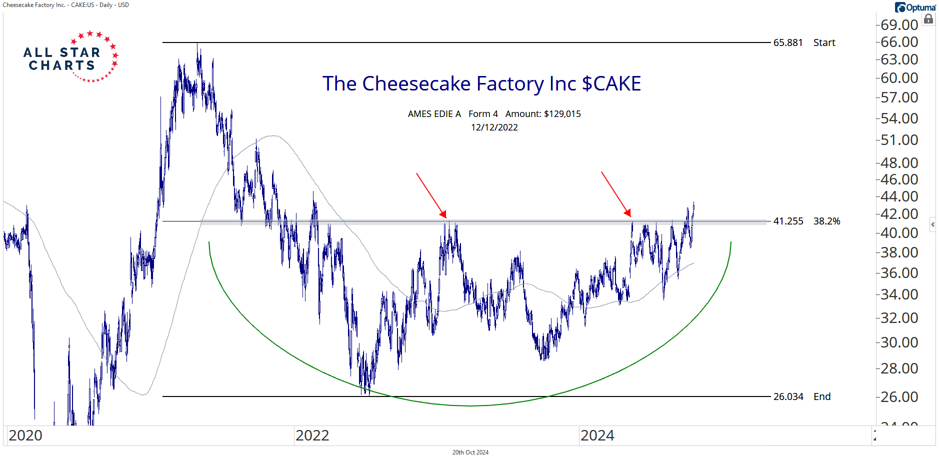 CAKE has been carving out a bearish-to-bullish reversal pattern for roughly three years.