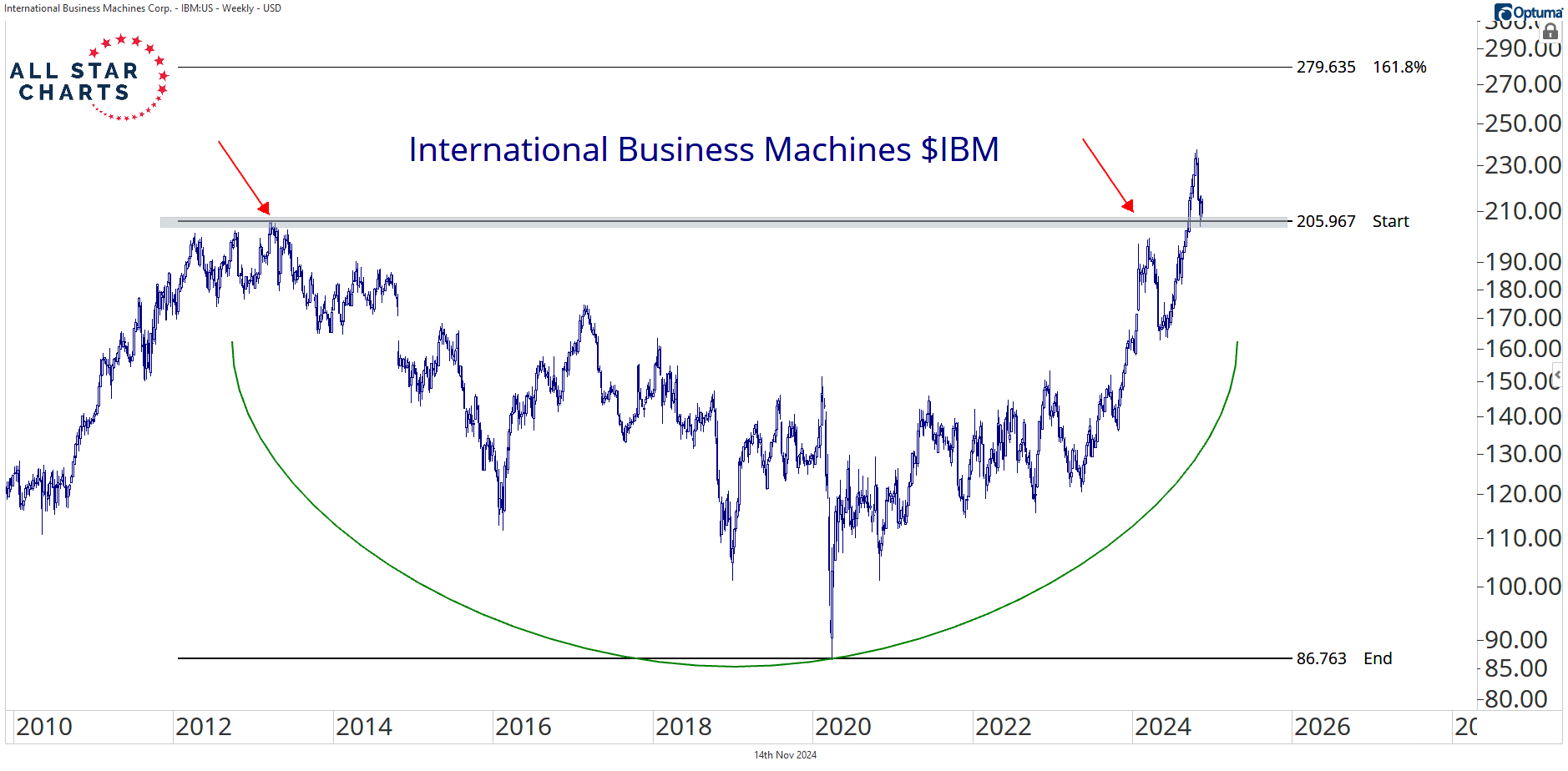 This represents a logical level to define risk and catch this trade if you missed the breakout two months ago. We want to stay long IBM as long as we’re above 205.