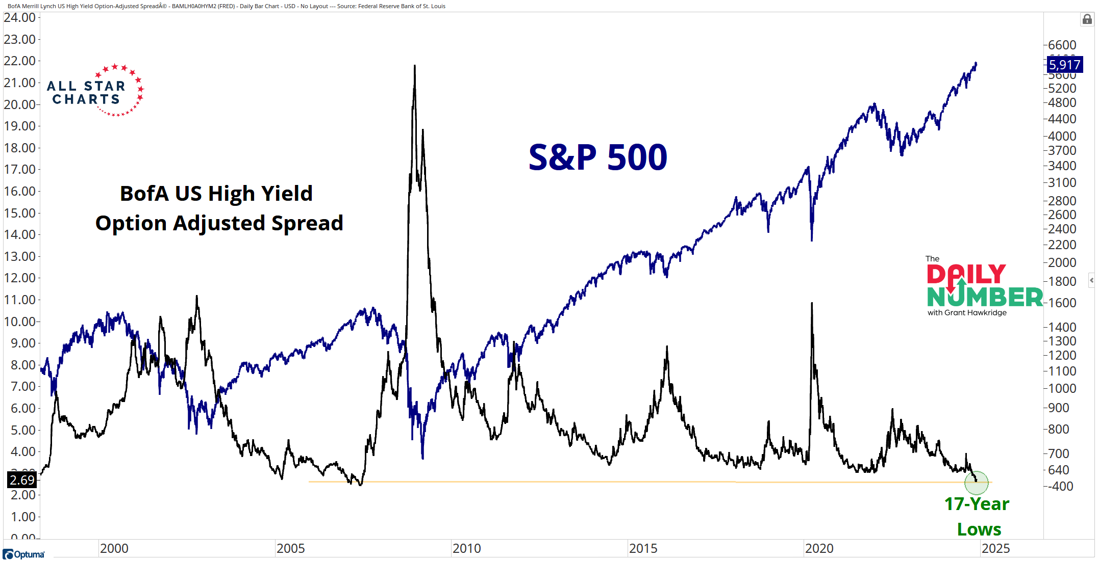 The BofA US High Yield Option-Adjusted Spread is at a 17-year low, a level not seen since before the GFC market crash.