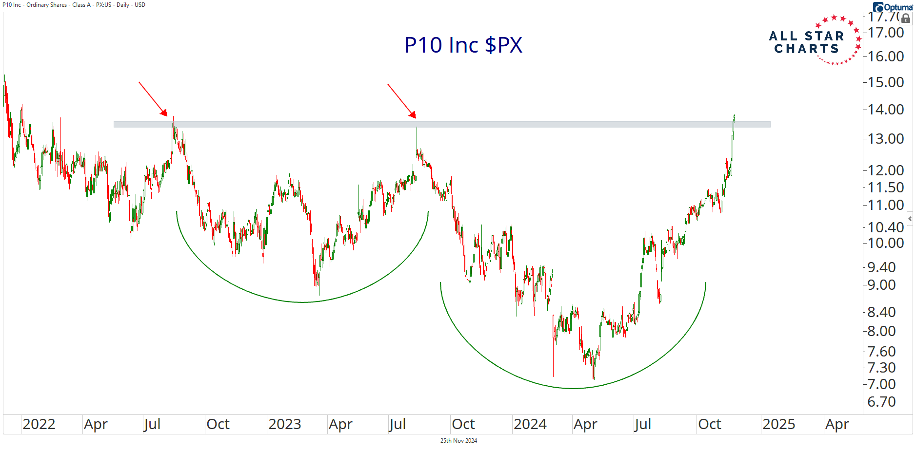 Price is reaching a key resistance level at a shelf of former highs. If and when the 13.50 level is exceeded, we like PX for a move toward its all-time highs.