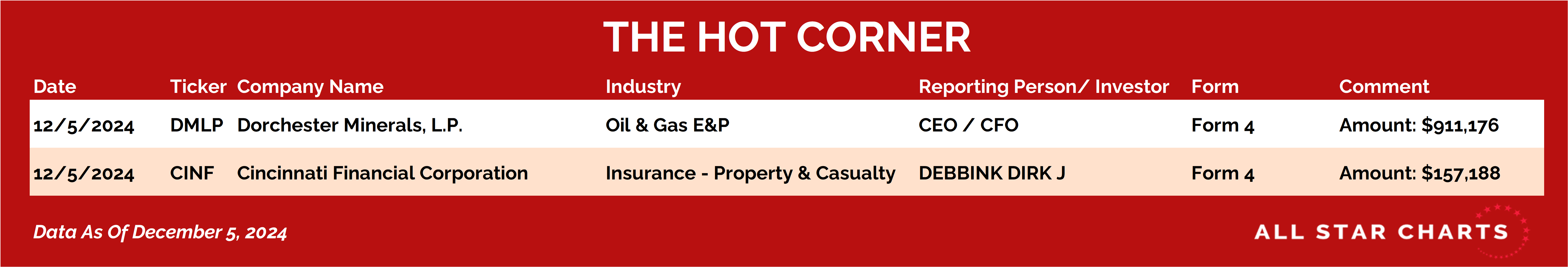 The most significant transaction on today's list comes in a Form 4 filing featuring both the CEO and the CFO of Dorchester Minerals $DMLP.