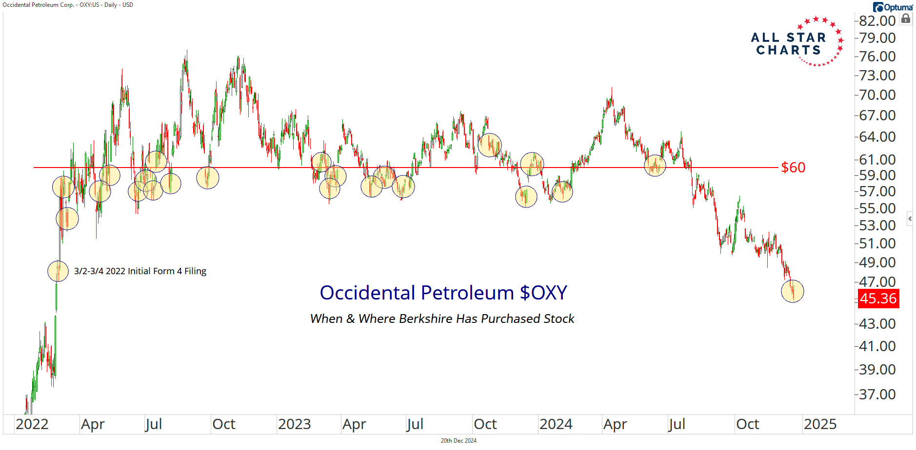 Here’s a chart highlighting the timing of Buffett’s $OXY purchases: