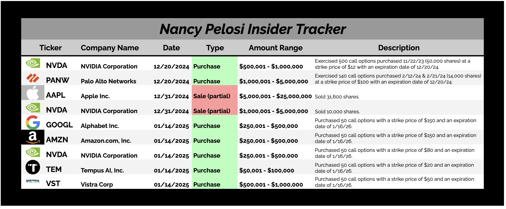 Rep. Nancy Pelosi is back on our list after filing a Periodic Transaction Report detailing transactions in multiple stocks.