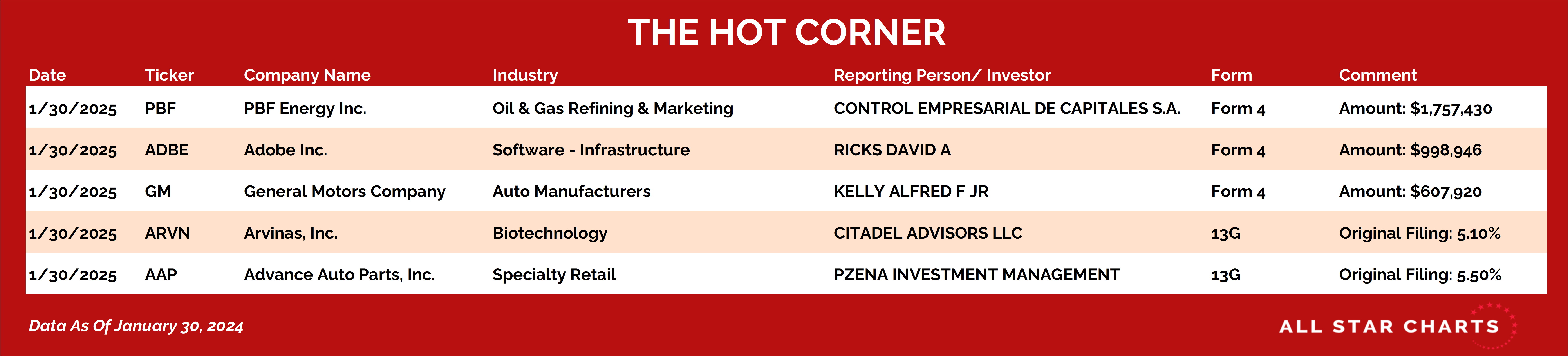 Here’s The Hot Corner, with data from January 30, 2025: