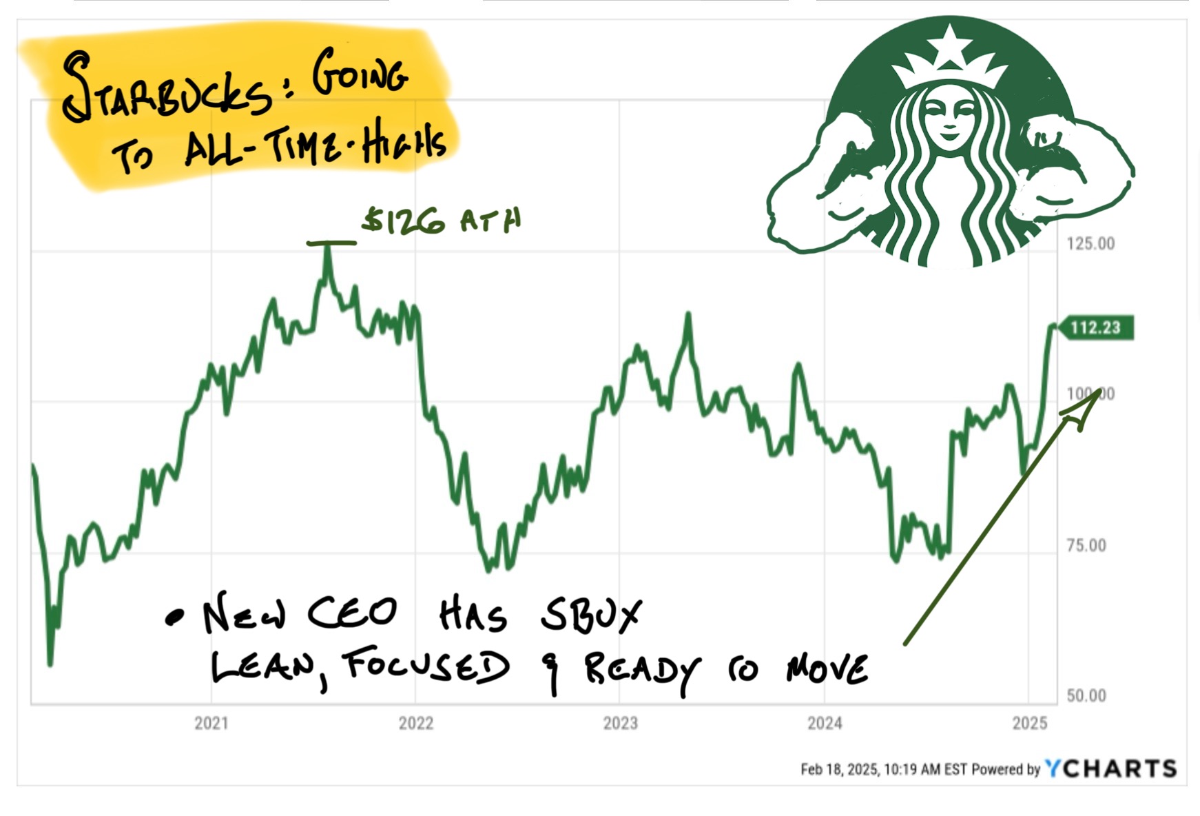 That last one is my favorite. It's customer-focused, easy to articulate and something the whole chain can use as an immediate goal. Even better anyone can check it! Last week I wrote about traveling ( https://www.stockmarkettv.com/2025-02-14/road-trip ) to NYC with the family. If there are 40,000 Starbucks worldwide it feels like roughly 100,000 of them are located in Manhattan. Literally every corner of midtown has a Starbucks. It's not at all unusual to be able to stand in a Starbucks and be able to see another Starbucks out the window.