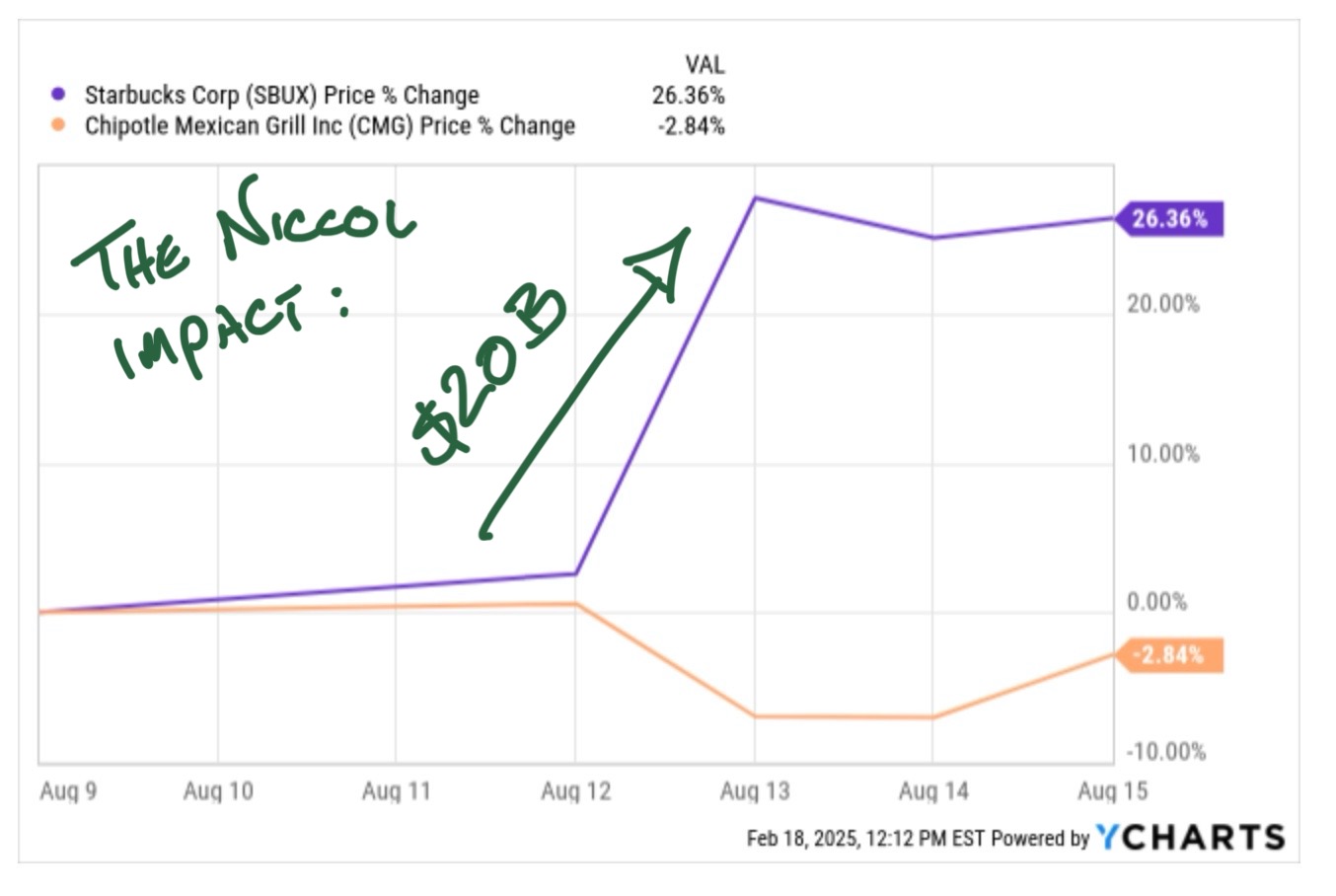 To the surprise of absolutely no one acting Starbucks CEO Laxman Narasimhan was fired after one more mediocre quarterly report. What was a surprise was who Starbucks picked the replace Narasimhan. After two prior shots at replacing Schultz with quant focused types in Kevin Johnson ("a Microsoft guy") and Narasimhan ("a former consultant") Starbucks finally stepped up and hired a big-name replacement who came with his own Aura: Chipotle CEO Brian Niccol.