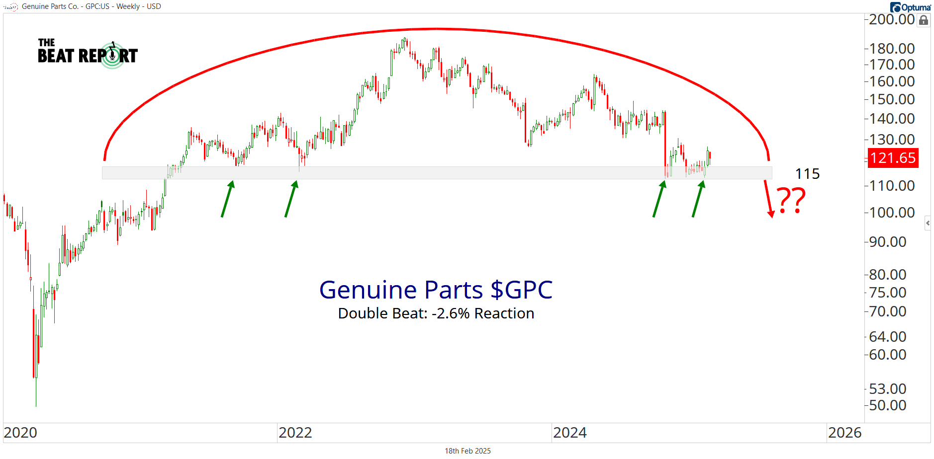 Genuine Parts reported a double beat but fell by 2.6%, with a reaction score of -1.9. This came after the stock's worst earnings reaction ever in Q4 2024.