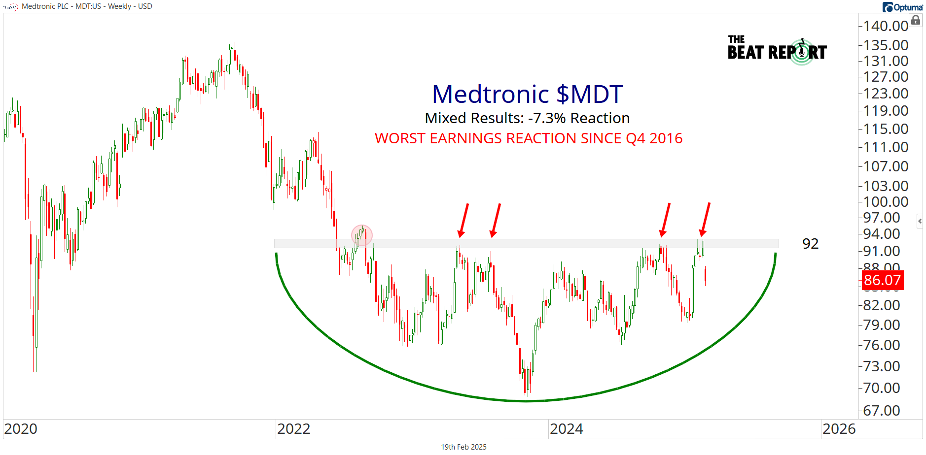 Medtronic reported mixed results and fell 7.3% with a reaction score of -6.6. It was a terrible reaction.