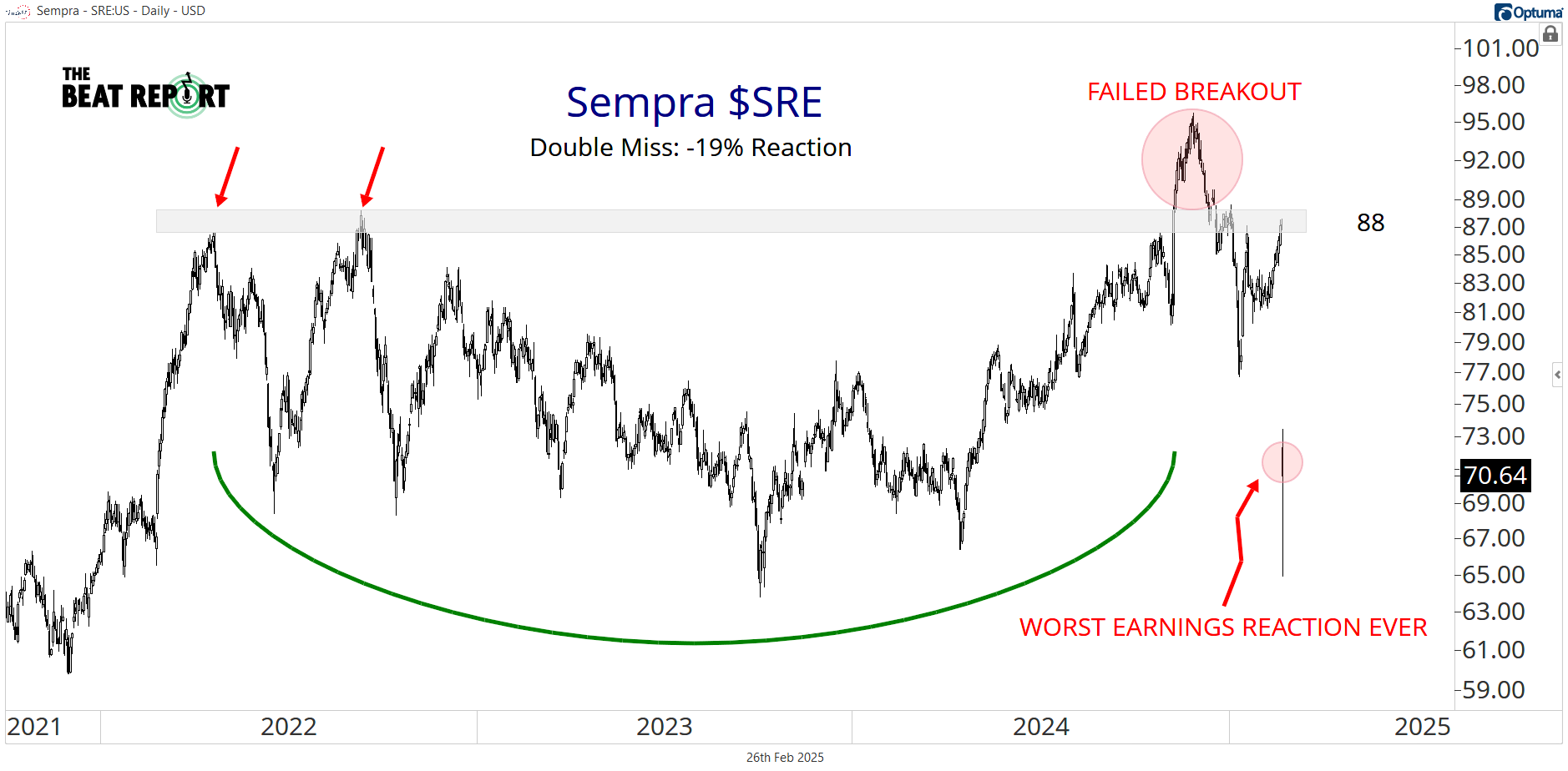 Sempra reported a double miss and fell nearly 20%. Its reaction score was a shockingly negative -10.