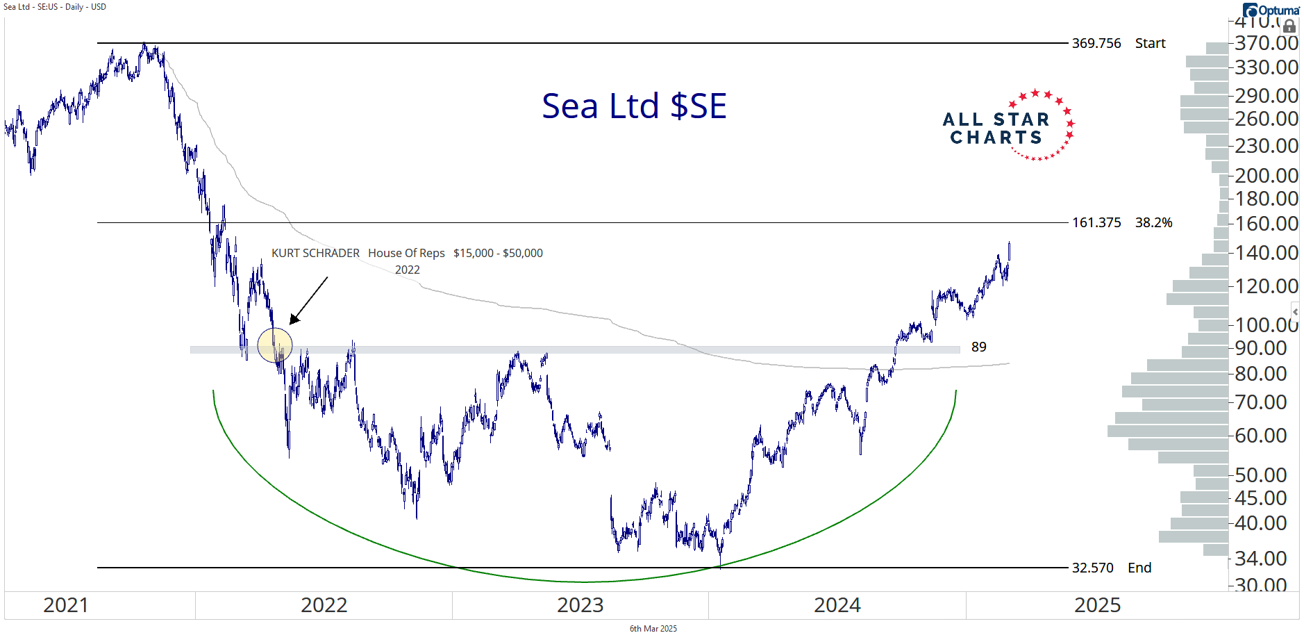 Next, this is Sea Ltd, the Amazon of Singapore. Former House Representative Kurt Schrader reported buying $50,000 worth of stock back in 2022.