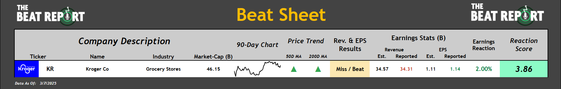 As you can see, Kroger missed its top-line expectations but beat the bottom line. The market rewarded it with a 2% rally and a 3.86 earnings reaction.