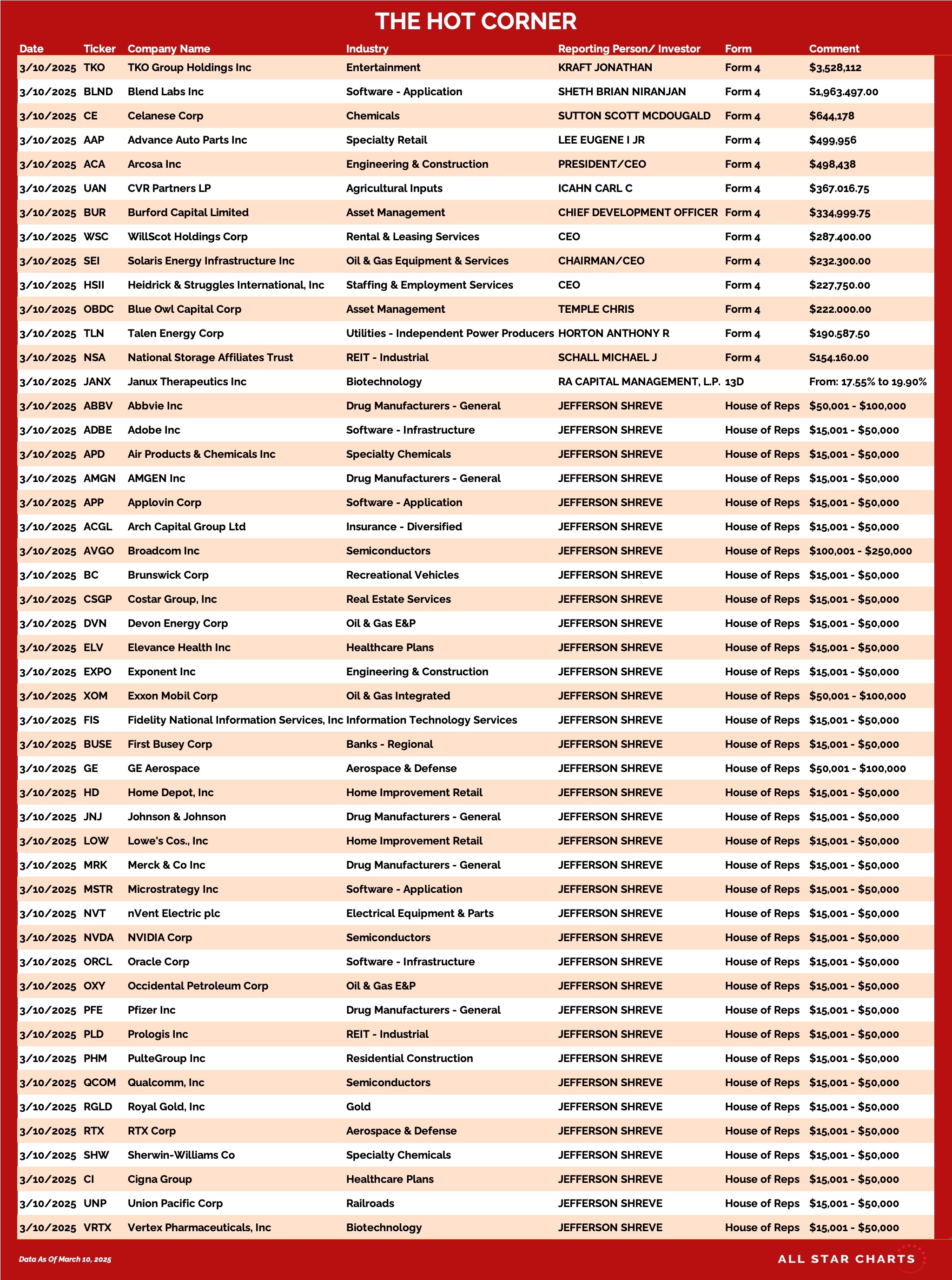 We have an assortment of noteworthy buys from directors and investment firms as well as C-level executives and members of Congress to report today.
