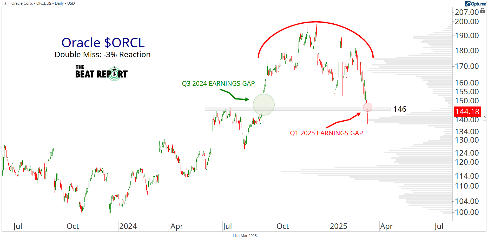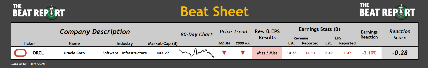 Oracle reported a double miss for the 2nd consecutive quarter and was punished for it. Shares fell 3.10%, with a reaction score of -0.28.