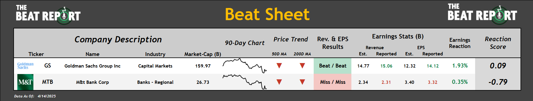 Goldman Sachs $GS had the best earnings reaction and reported a double beat with a muted reaction score of 0.09.