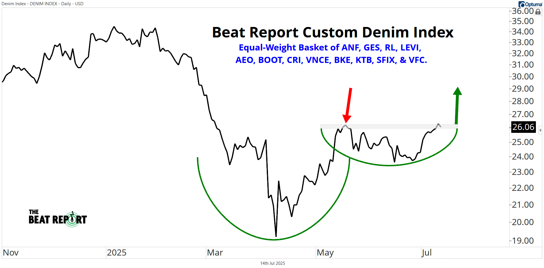 Our custom denim index, which tracks an equal-weight basket of names like ANF, RL, GES, LEVI, and others, is carving out a textbook bearish-to-bullish reversal pattern.