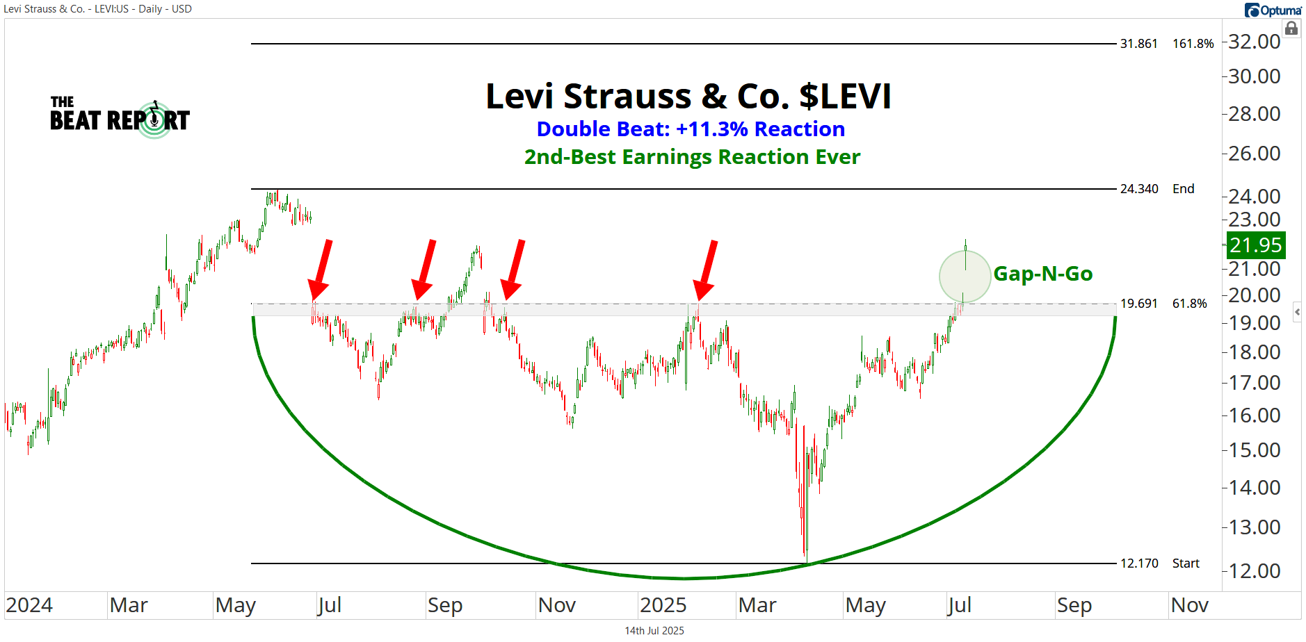Levi Strauss & Co. just posted its second-best earnings reaction ever with an 11.3% surge following a strong double beat.