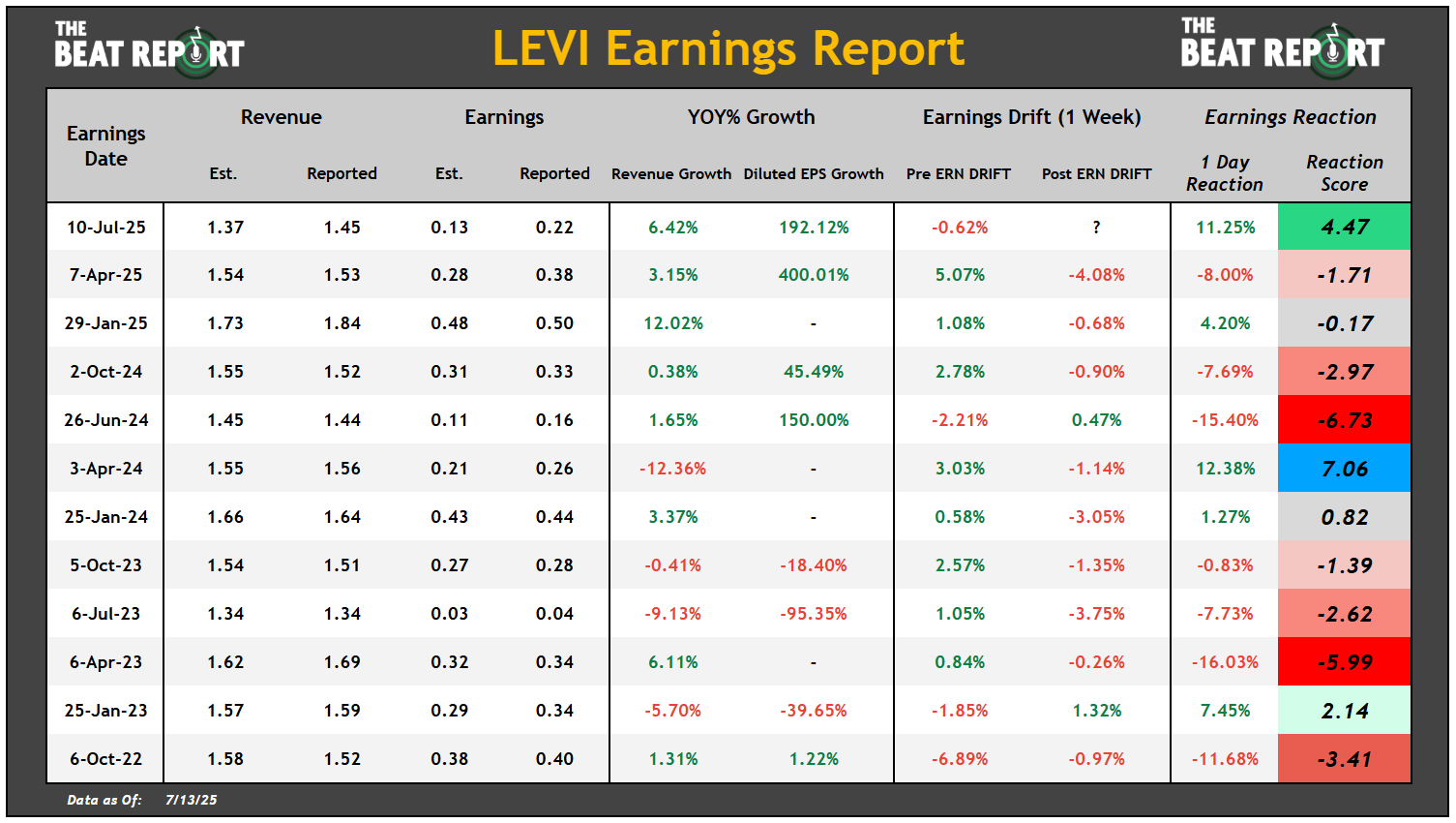 Here’s a look at Levi’s earnings track record over the last few years. As you’ll notice, strong follow-through has been rare, making Friday’s breakout even more notable.