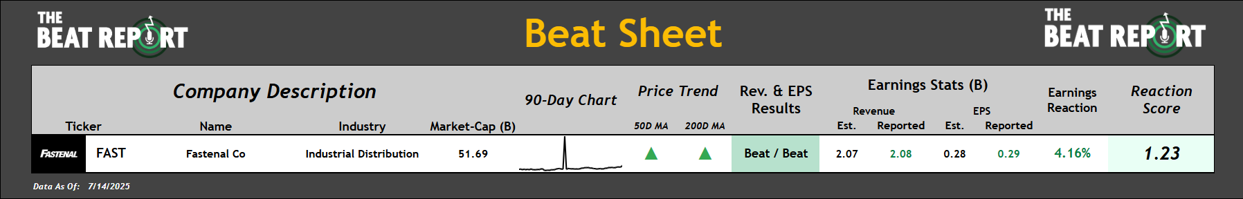 Fastenal had a +1.23 reaction score after reporting a double beat.