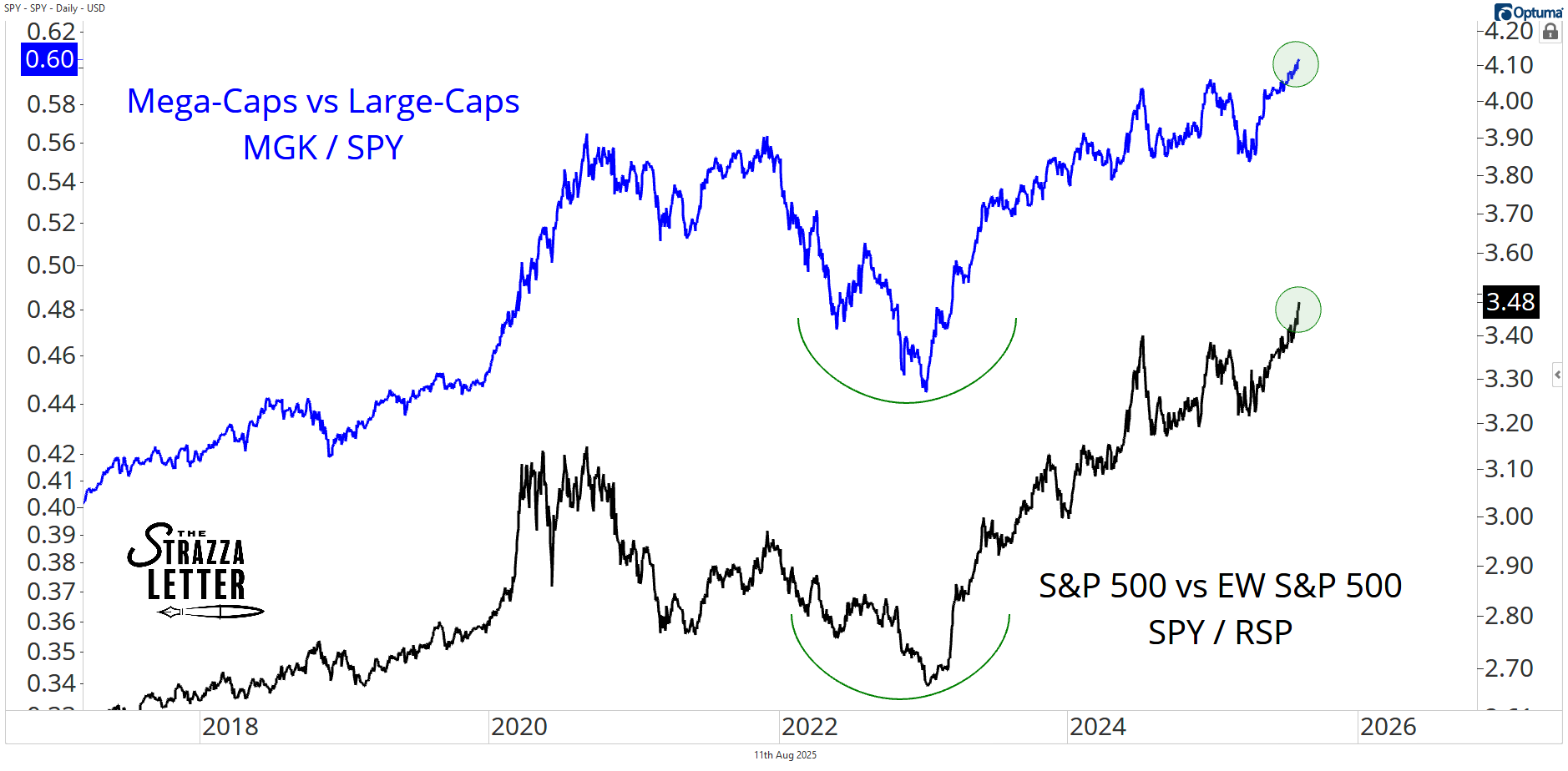 As such, the mega cap growth index is beating the cap-weighted S&P in the same way the S&P is beating its equal-weighted counterpart. And notice how this is true over the longest timeframes.