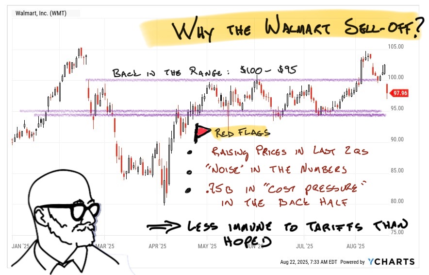 Same as yesterday. If you don't own any Walmart and are looking to add quality (at a slightly high price), I love adding in the mid-90s. Walmart noted a couple times that Back-to-School was strong, which suggests Halloween and Christmas will be good as well. If the season unfolds as expected, look for WMT and COST to start making progress around November, ahead of the 3Q reports.